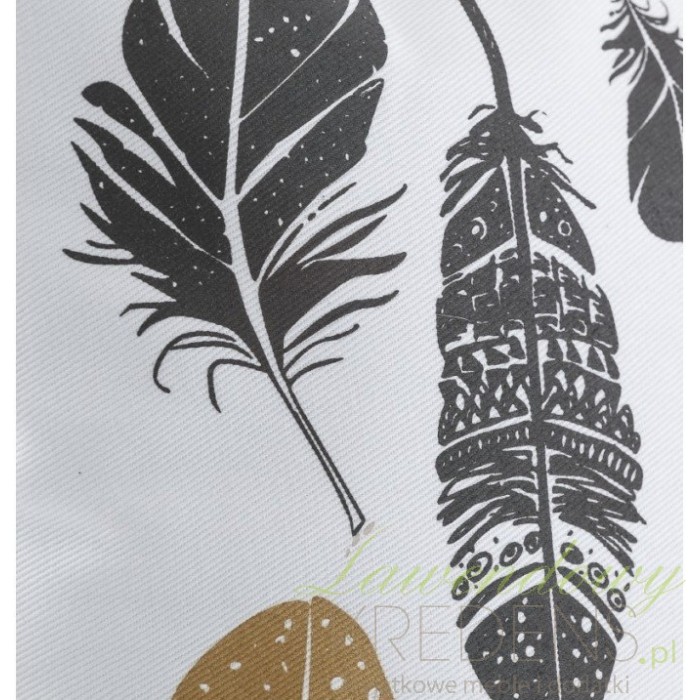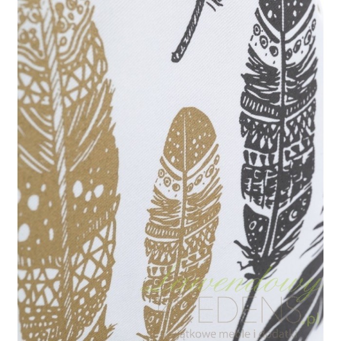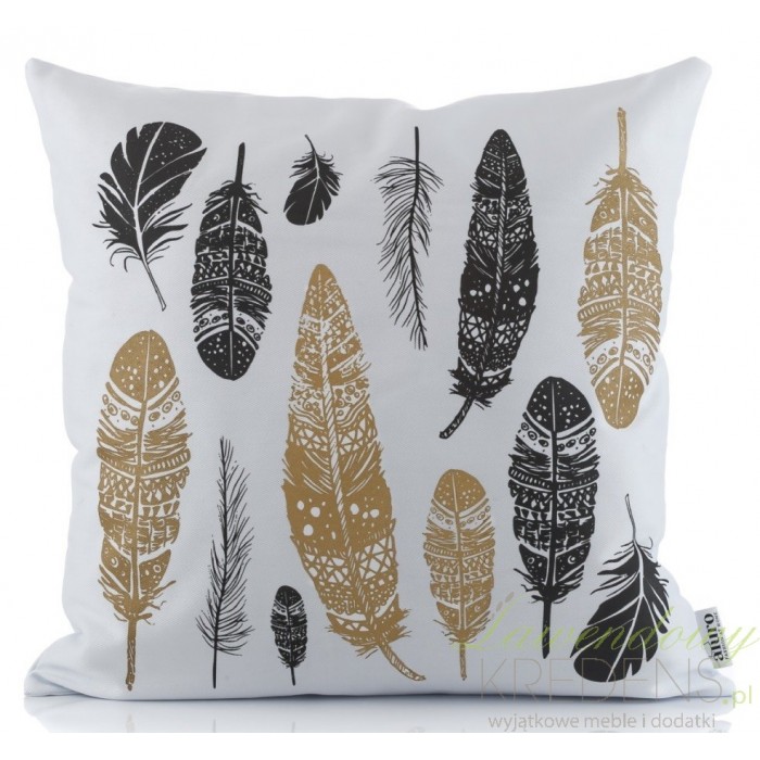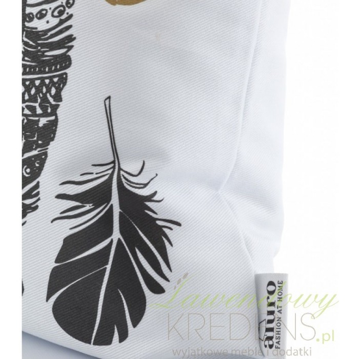 Biała poduszka ozdobna Aluro w pióra to modna i niezwykle oryginalna poduszka z grafiką w złotym i czarnym kolorze.