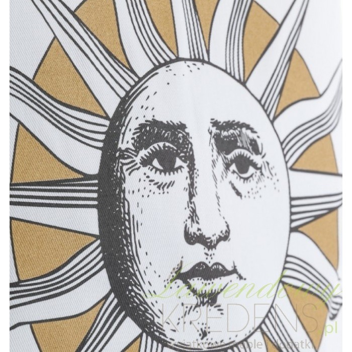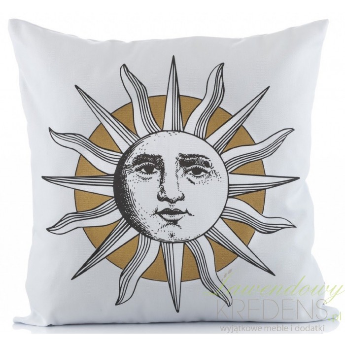 Biała poduszka ozdobna Aluro została uszyta z bawełny i wypełniona poliestrowym wypełnieniem. Grafika na poduszce przedstawia złote koło, na którym widnieje biało-czarne słońce z twarzą. Poduszki Aluro zostały stworzone specjalnie dla wyjątkowych i designerskich aranżacji. Artykuły dekoracyjne takie jak poduszki z twarzą to modne i interesujące wzornictwo.