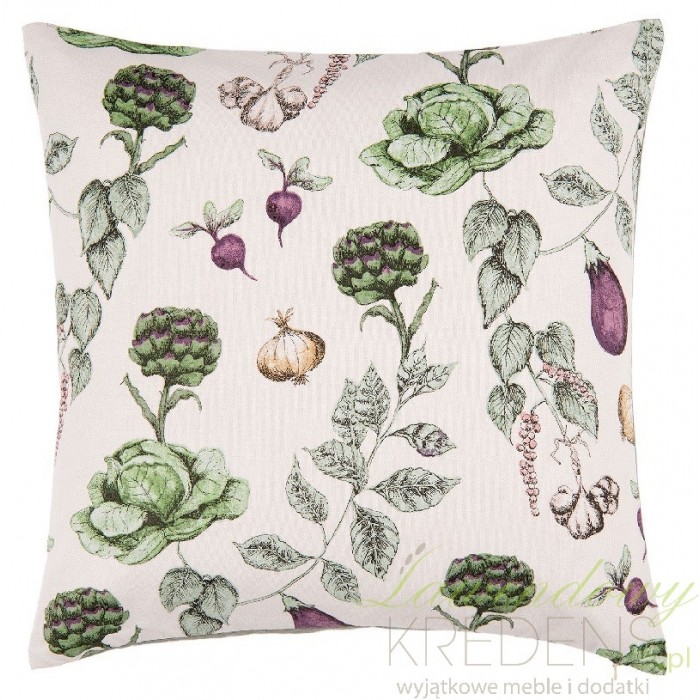 Poszewka ozdobna w stylu prowansalskim ma jasny kolor i jest udekorowana gęsto rozmieszczonymi warzywami. Motyw warzyw doskonale sprawdzi się wykorzystany np. na sofie w jadalni. Kwadratowa poszewka to cudna