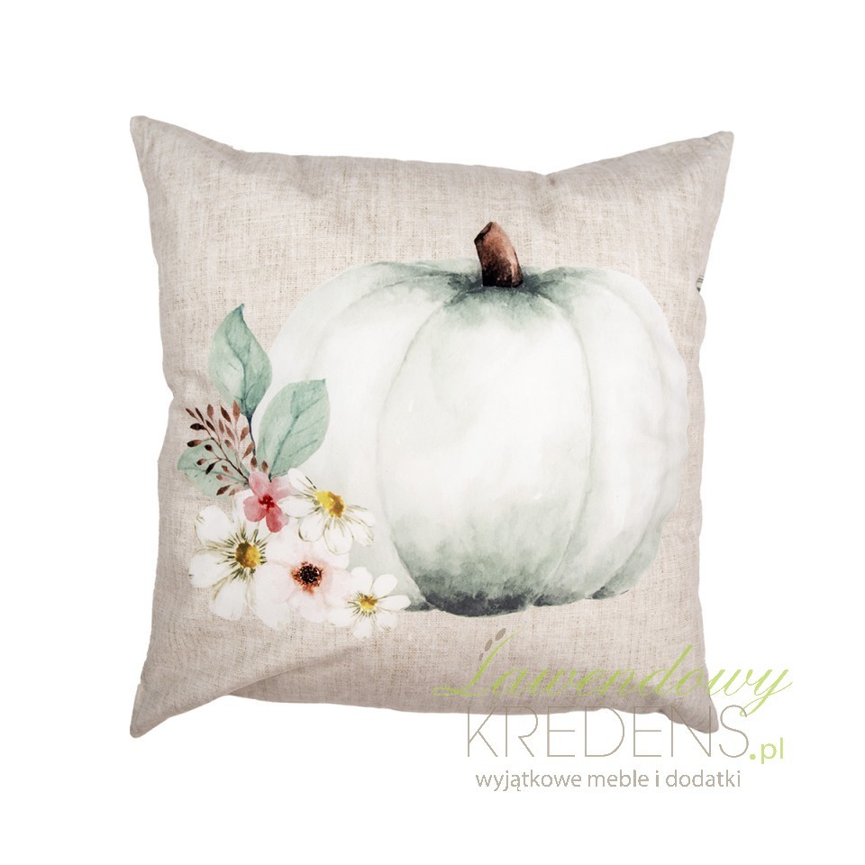 Z jednej strony poszewki widnieje motyw zielonej dyni, otoczony delikatnymi, białymi kwiatami, co nadaje jej przytulny i naturalny charakter. Kompozycja ta tworzy sielski, ciepły nastrój, kojarzący się z sezonem zbiorów i domowym ciepłem.