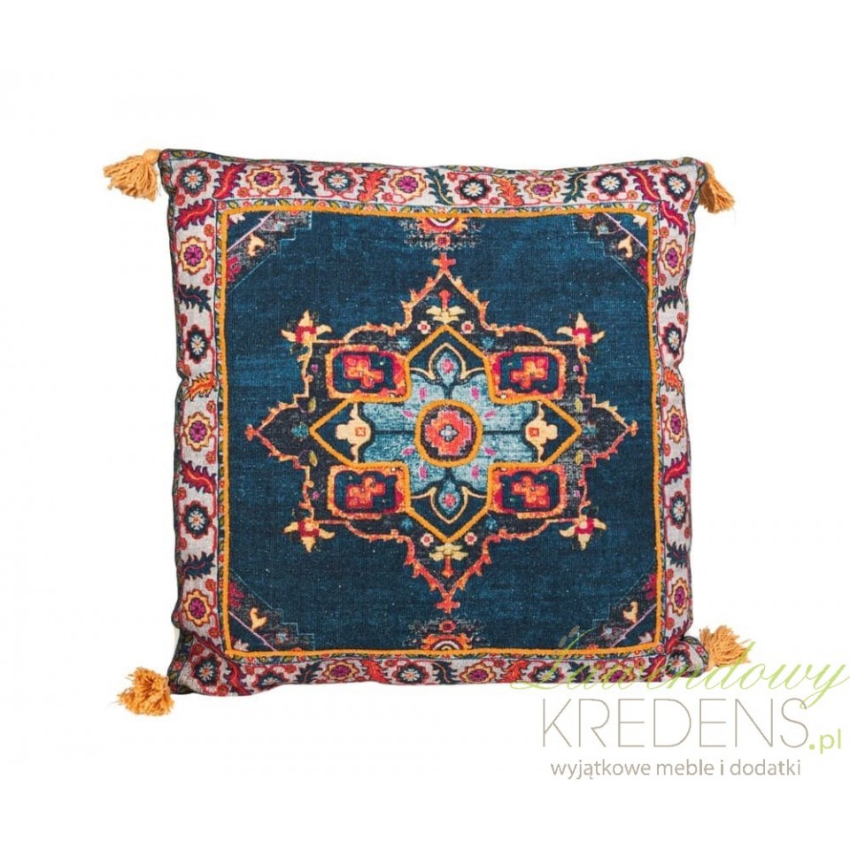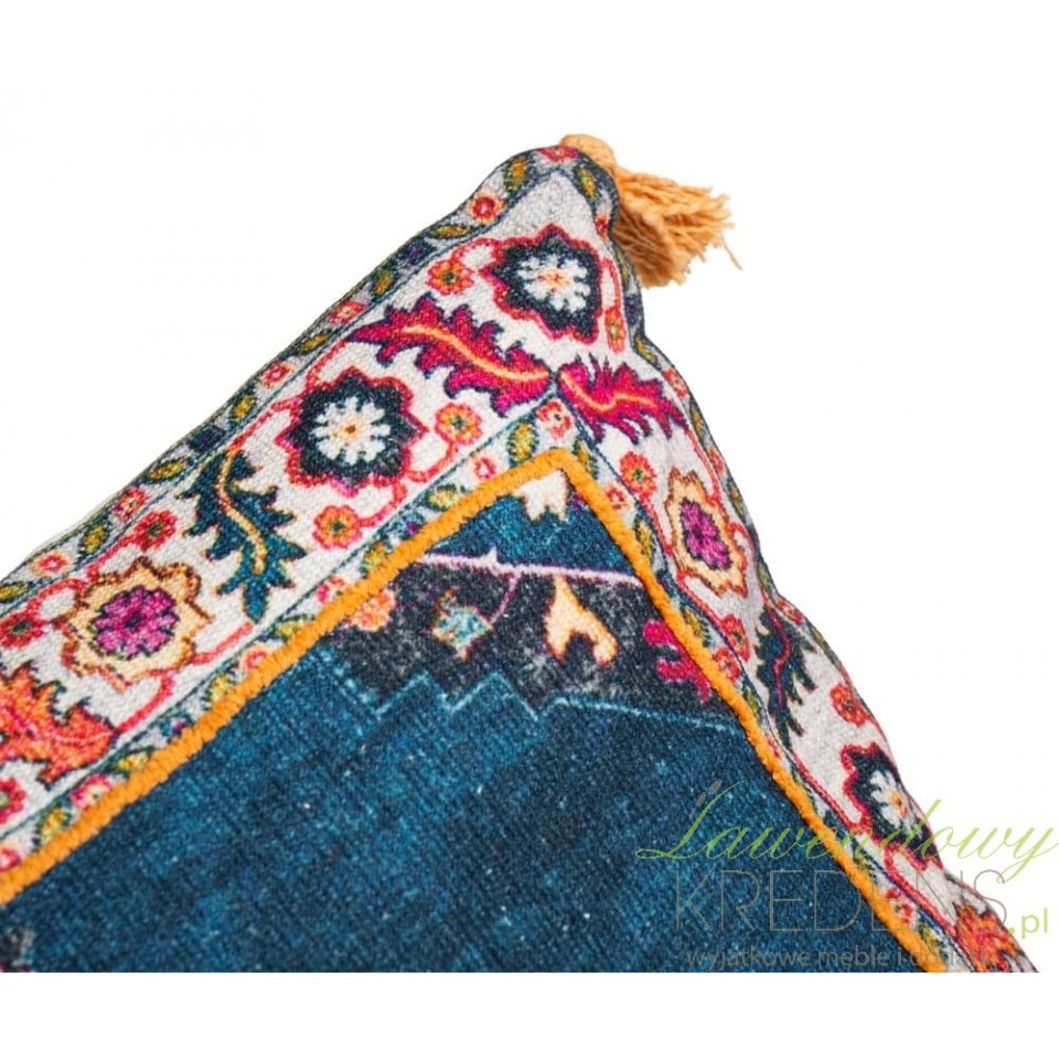 Jeśli sofa lub łóżko wyglądają „płasko”, a Ty chcesz dodać charakteru bez remontu, sięgnij po poduszkę dekoracyjną Belldeco Boho 3A. Ten model działa jak mocny akcent: przyciąga wzrok głębokim, niebieskim tłem i orientalnym ornamentem, dzięki czemu od razu ociepla aranżację i nadaje jej warstwowość.Wzór boho z etnicznym ornamentem i wyrazistą ramą