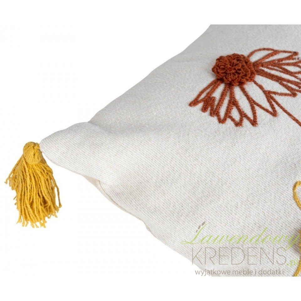 Front zdobi haft roślinny w ciepłej palecie: miodowe żółcie, rdzawy terakot, zgaszone zielenie i akcenty niebieskiego. Ten haft działa jak ilustracja – przyciąga wzrok, ale nie dominuje. Cztery chwosty w narożnikach dodają miękkiego, swobodnego charakteru boho i ładnie wyglądają w ruchu, gdy poduszkę przekładasz z fotela na kanapę.Jak zestawić Belldeco Boho 16 z sofą, pledem i innymi poduszkami