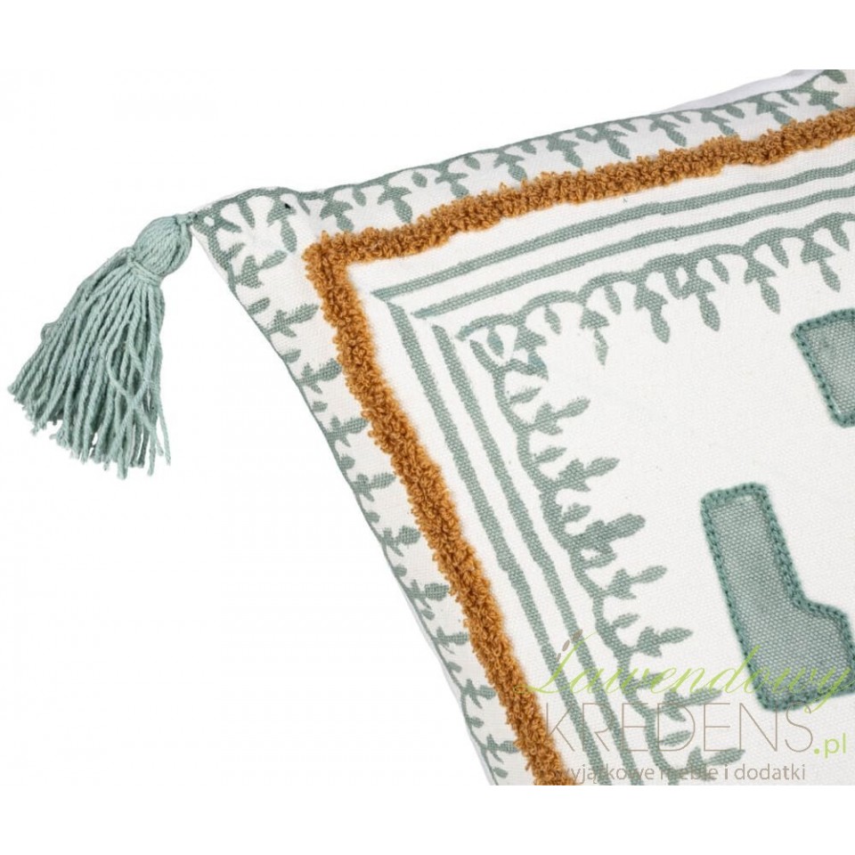 W tej poduszce pracują detale: graficzne motywy w odcieniach szałwii na jasnym tle, dekoracyjna ramka oraz kontrastowa, pleciona lamówka, która porządkuje kompozycję. Całość wygląda jak tkanina inspirowana ręcznym drukiem — pasuje do wnętrz boho, japandi, eko, a także do spokojnego minimalizmu, któremu brakuje „duszy”.Gdzie ją ułożyć, by wyglądała jak projekt od stylisty wnętrz