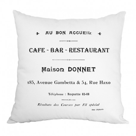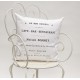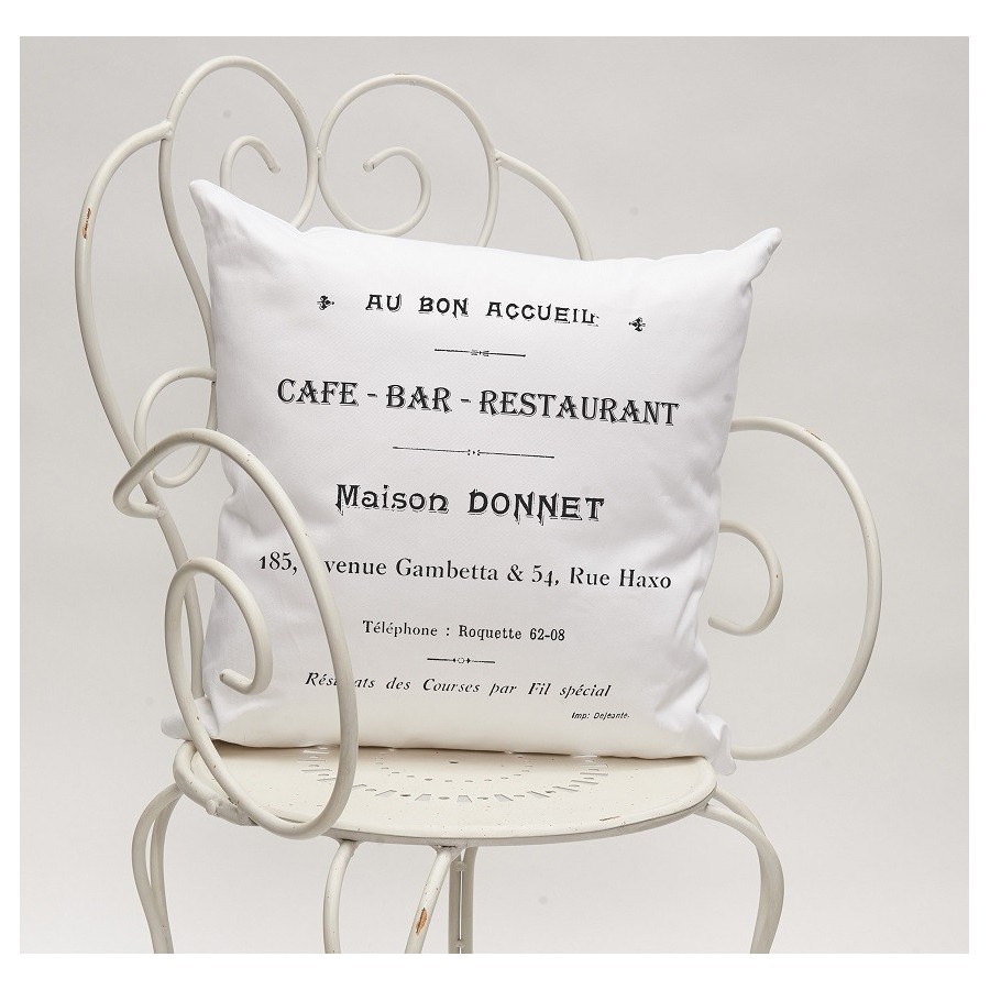 Poduszki ozdobne z białą poszewką ze stuprocentowej bawełny, na której znajdują się francuskie napisy.