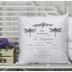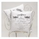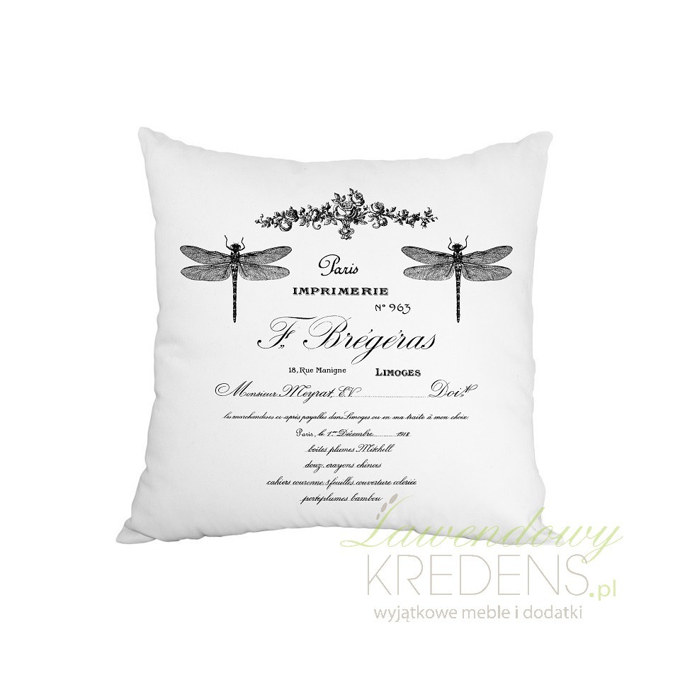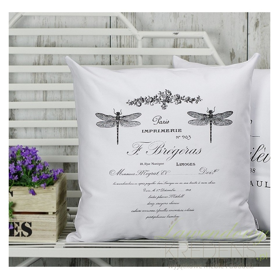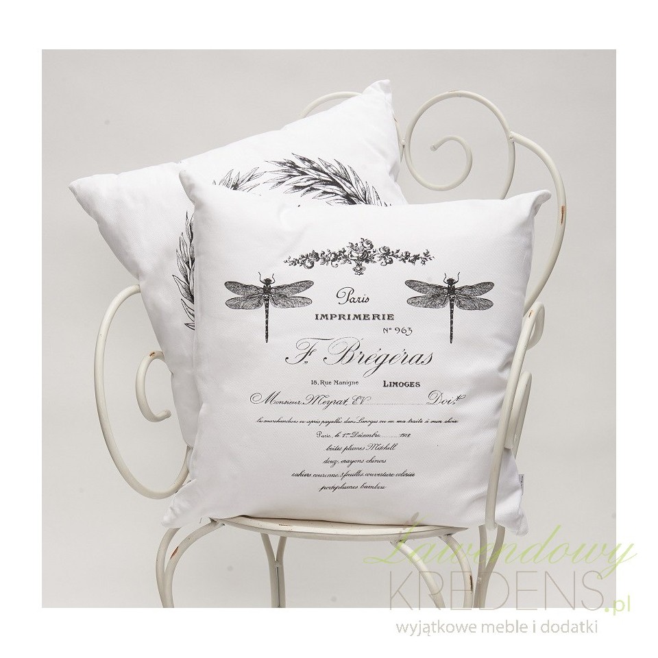 Białe poduszki ozdobne French Home z motywem ważek i francuskich napisów.