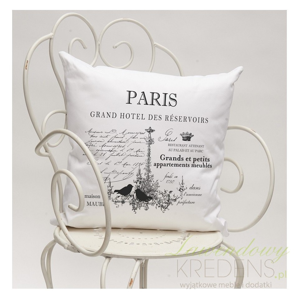 Poduszki ozdobne PARIS to urokliwe, białe poduszki w stylu francuskim marki French Home na których poszewkach widnieją francuskie napisy oraz żyrandol z dwoma ptaszkami. Poduszki są piękną dekoracją, a dzięki wysokiej jakości wypełnieniu nie odkształcają się z biegiem czasu. Poszewki rozpinają się na suwak, więc można je zdjąć i uprać w pralce.