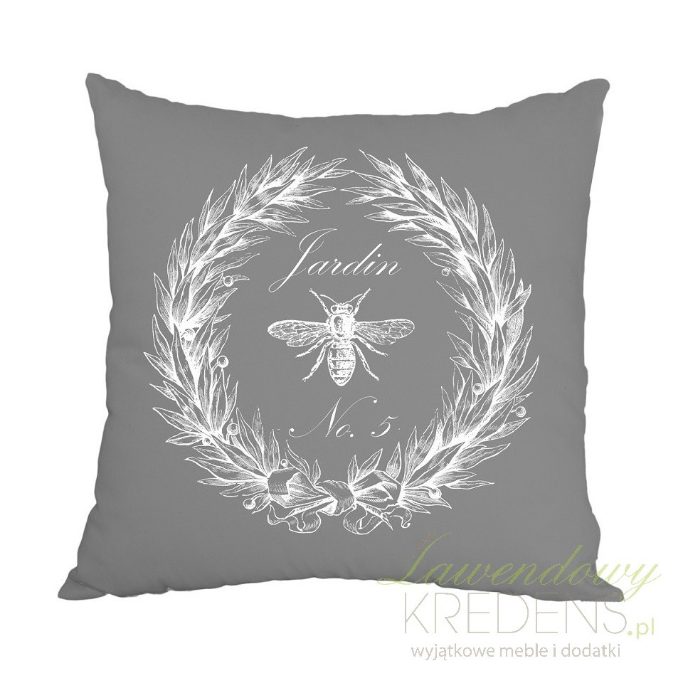 Kwadratowe poduszki dekoracyjne zostały wyprodukowane przez polską markę French Home. Na powierzchni szarej poduszki znajduje się dość nietypowa grafika – wizerunek wieńca laurowego przewiązanego kokardką oraz podobizna muchy. Rysunki podpisano wyrazami o pięknej czcionce.