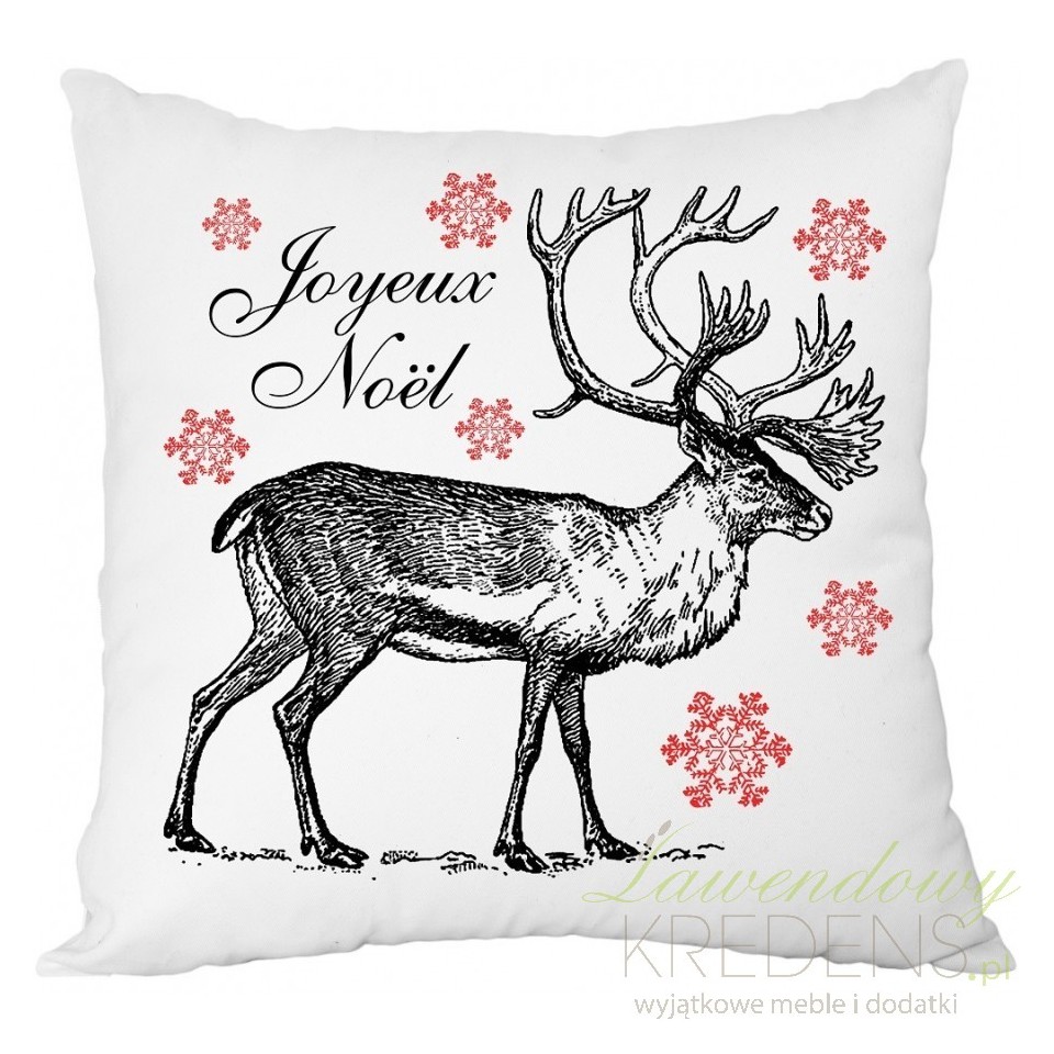 Poszewka z łosiem stanowi oryginalnie ozdobiony przedmiot, który wykonano ze 100% bawełny. To urocze tekstylium zostało wykonane przez polską firmę French Home. Artysta ozdobił poszewkę wizerunkiem dumnie kroczącego łosia, wokół którego umieszczono czerwone płatki śniegu o finezyjnym kształcie. Cena dotyczy samej poszewki.