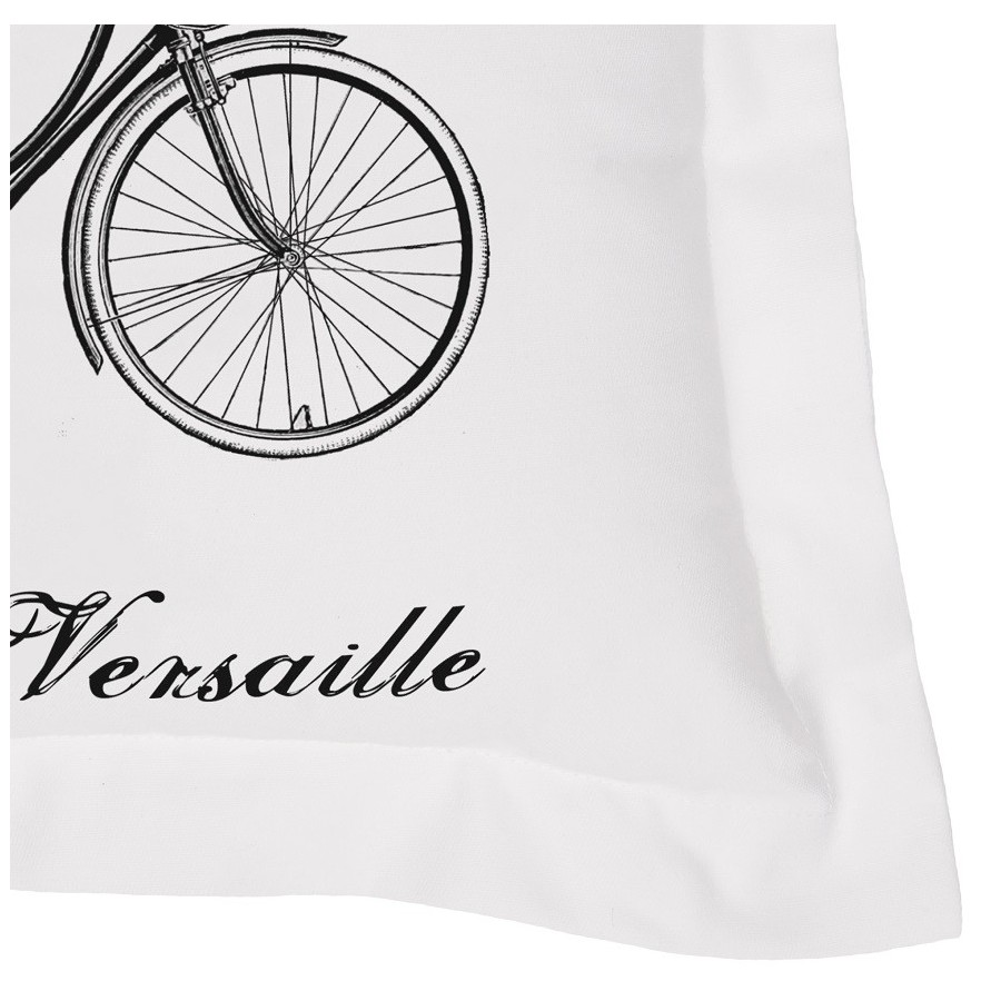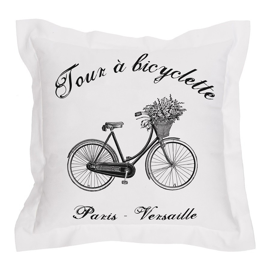 Bardzo eleganckie poduszki French Home, które służyć mogą zarówno jako poduszki dekoracyjne w salonie czy wygodne elementy dekoracyjne w kawiarczy czy pokoju gościnnym. Klasyczna biel skontrastowana z czarna grafikę przedstawiającą piękny, klimatyczny rower i czarnymi napisami w języku francuskim.
