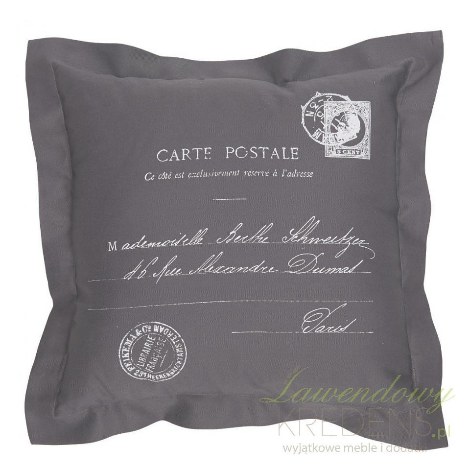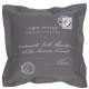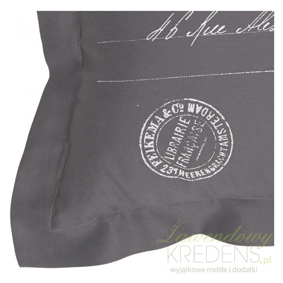 Poduszki w stylu francuskim to kwadratowe przedmioty w kolorze szarym, które posiadają skromnie wyglądającą grafikę. Na powierzchni poduszki znajdują się napisy oraz odciski stempli w białym kolorze. Obejrzyj inne produkty marki French Home!
