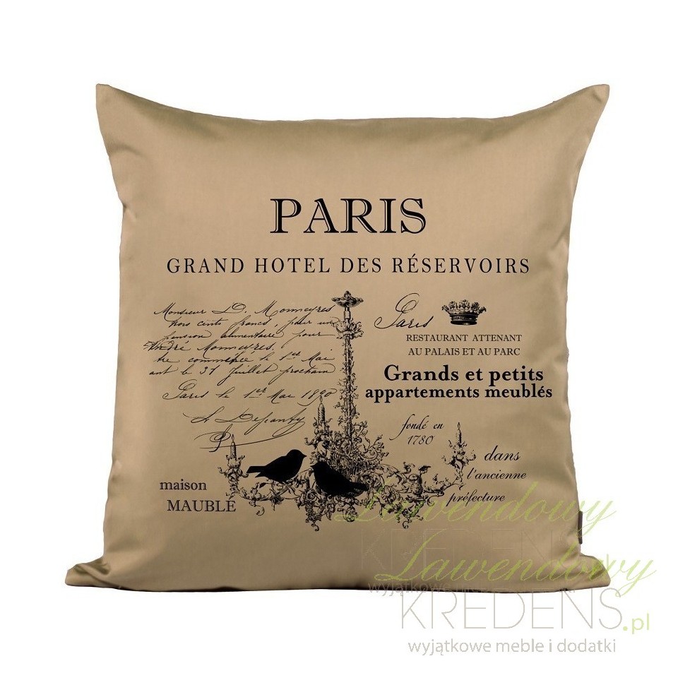 Poduszki francuskie w neutralnym beżowym kolorze z czarnymi nadrukami - super wygodne i pięknie wyglądające. Przyciągająca wzrok grafika przedstawia francuskie napisy otaczające piękny żyrandol z siedzącymi czanymi ptaszkami! Beżowe poduszki doskonałe do ogrodu, salonu czy sypialni!