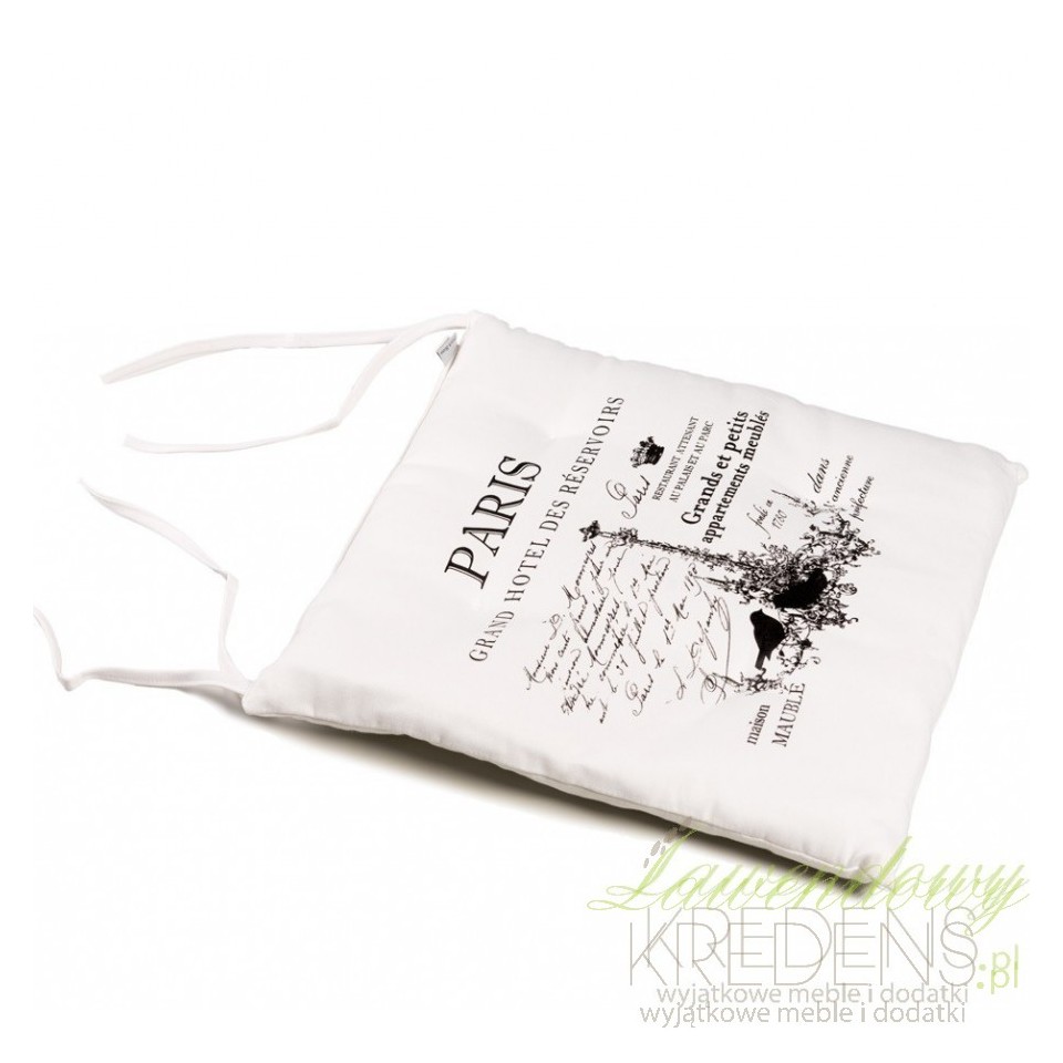 Białe, pikowane poduszki na krzesła w stylu francuskim marki French Home wykonane ze stuprocentowej bawełny i ozdobione czarną grafiką. Poduszki można prać w pralce i przywiązać do oparcia krzesła dzięki znajdującym się przy jednej krawędzi poduszek sznureczkom.