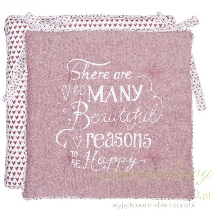 Poduszki ozdobne wykonane z bawełny zapewnią komfort siedzenia na krześle. Poduszki na krzesła z naszej oferty są dwustronne, po jednej stronie mają piękny wzór serduszek a po drugiej pozytywny napis w języku angielskim. Poduszka na krzesło będzie uroczym elementem dekoracyjnym, dzięki niej możesz w cudowny sposób ozdobić siedzisko!
