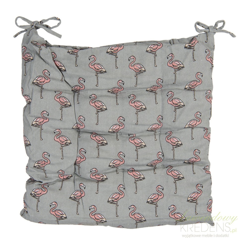 Szara poduszka na krzesło z flamingami to dodatek odpowiedni do kuchni, w której znajdują się drewniane lub metalowe krzesła.