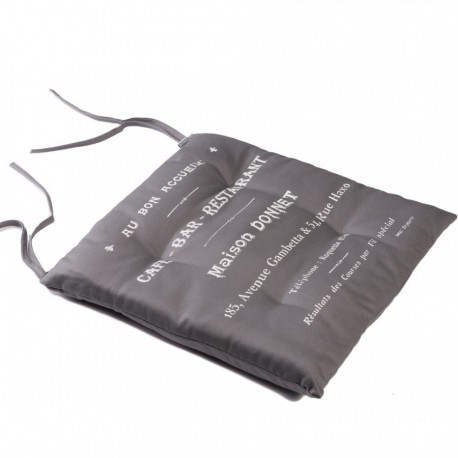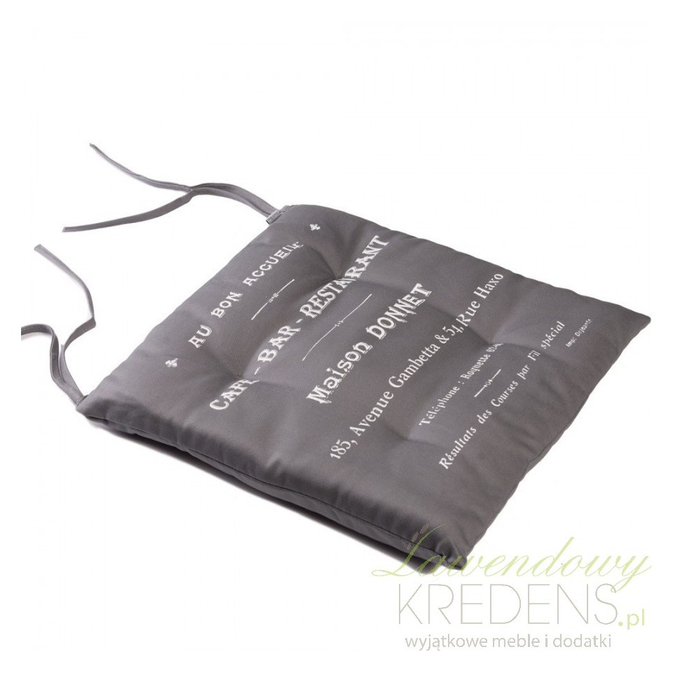 Szare poduszki na krzesła z różnymi, białymi napisami po francusku oraz pikowaniem.