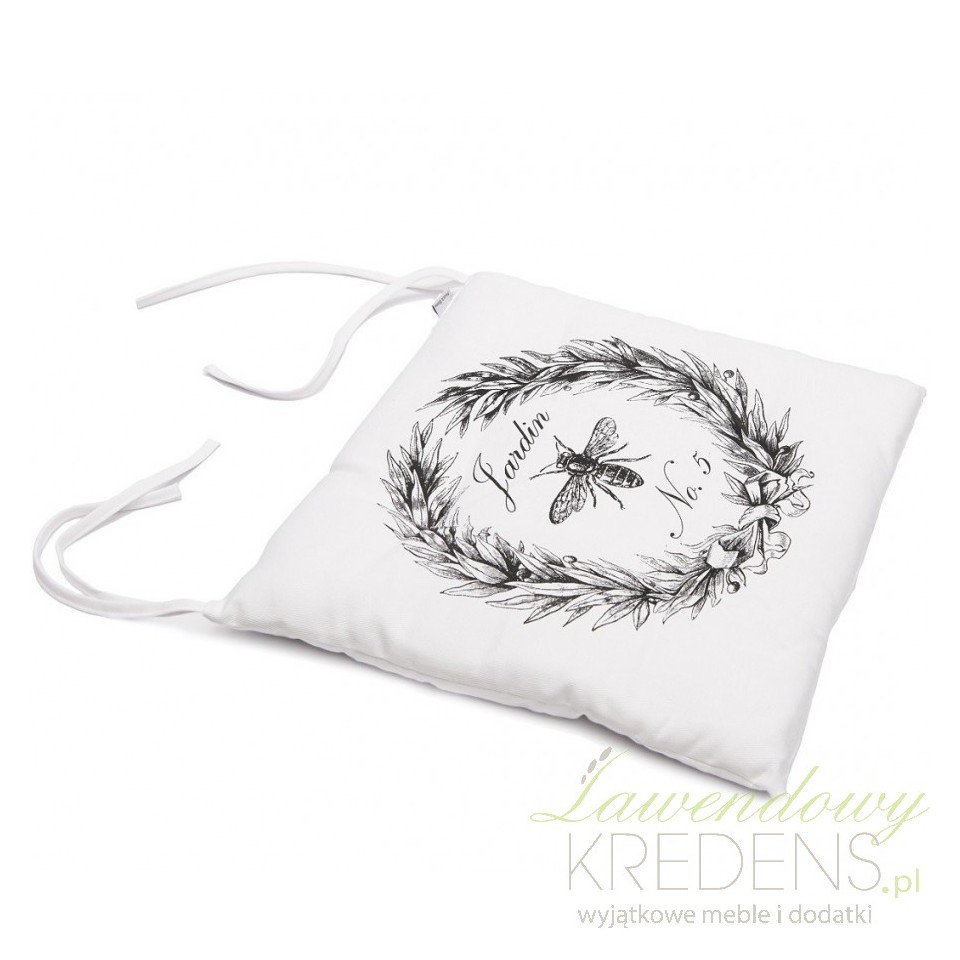 Śliczne poduszki ozdobne polskiej marki French Home nadadzą wyjątkowy wygląd każdemu pomieszczeniu. Poduszki na krzesła wykonane są z bawełny w białym odcieniu z dużym czarnym laurem w środku i z czarną ważką oraz napisem Jardin i dwoma białymi sznurkami u góry.