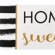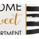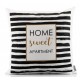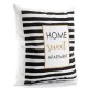 Poduszka ozdobna Aluro z czarnymi, poziomymi paskami i angielskimi, czarno-złotymi napisami w złotej ramce.