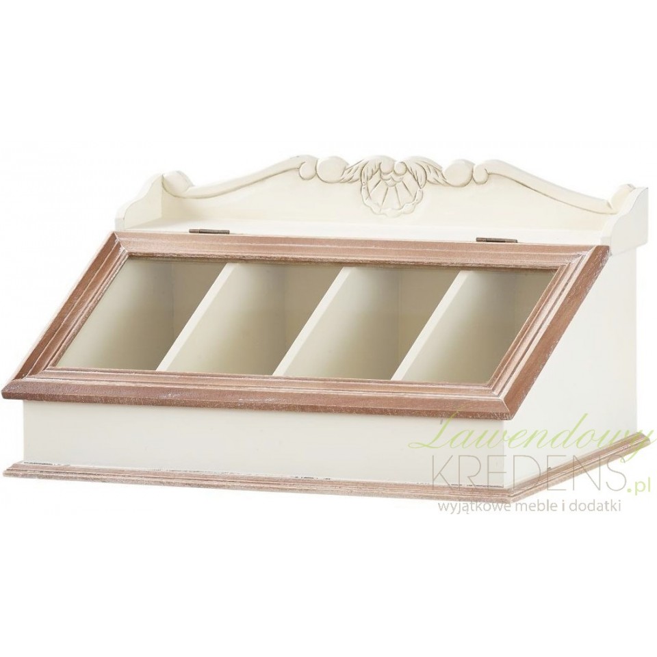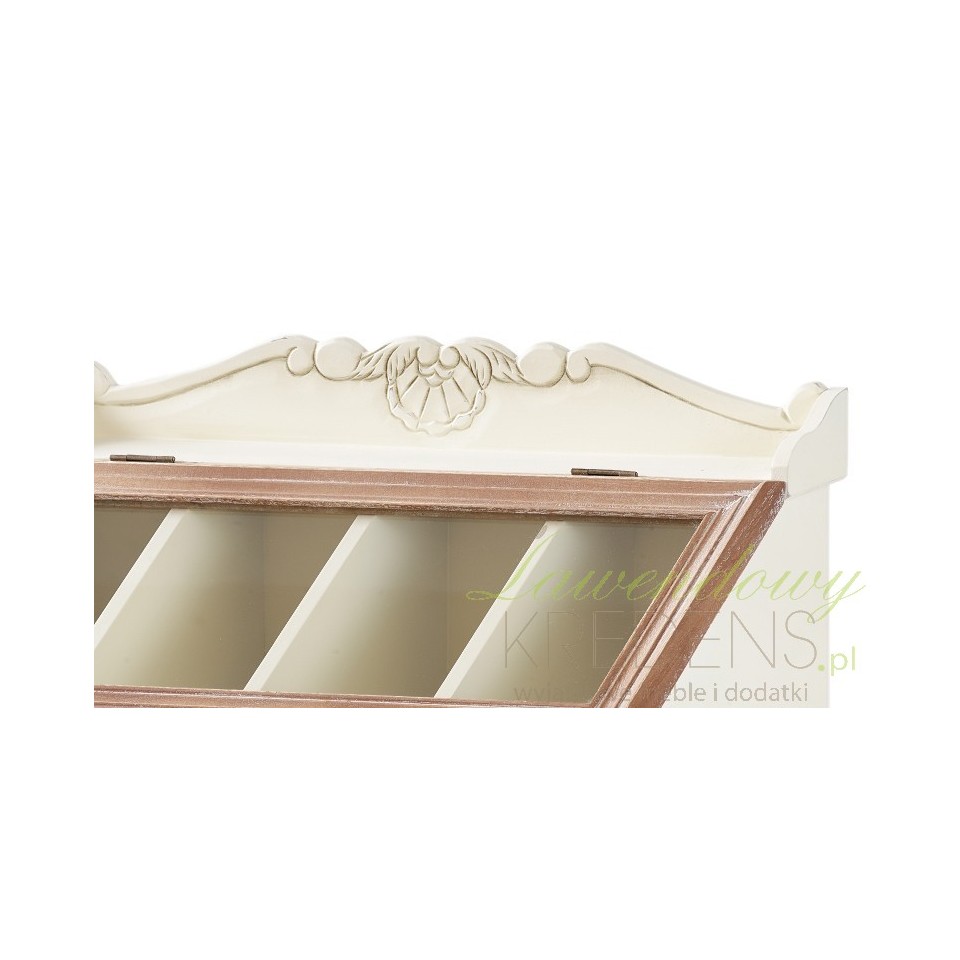Jeśli kochasz stylowe dodatki w stylu francuskim to polecamy organizer z czterema przegródkami, zamykany przeszklonym wieczkiem. Piękna drewniana obudowa w kolorze kremowym doskonale współgra z brązową podstawą i obramowaniem wieczka. Dzięki odpowiedniej głębokości organizer słuzyć może także jako pojemnik na sztućce!