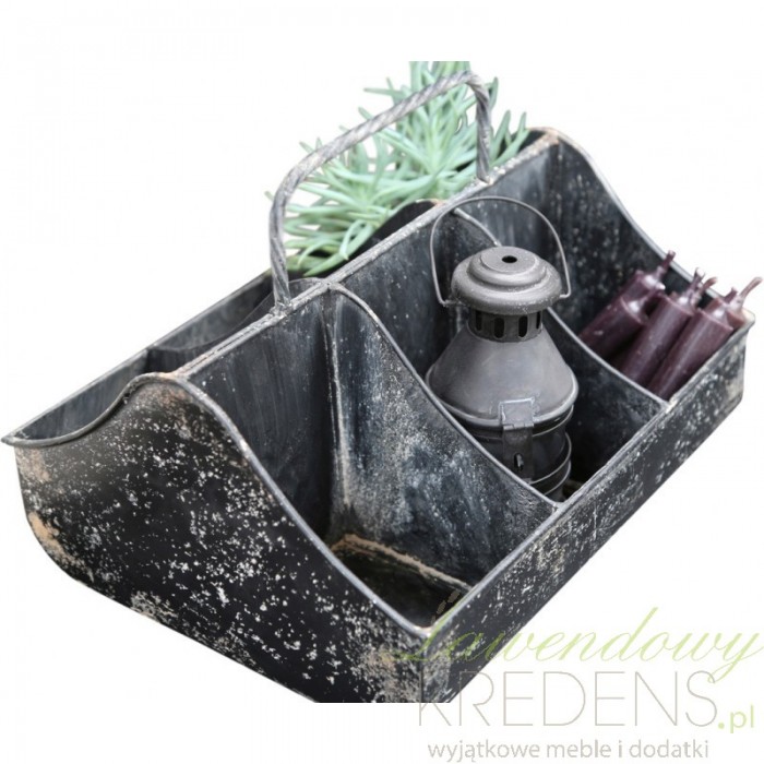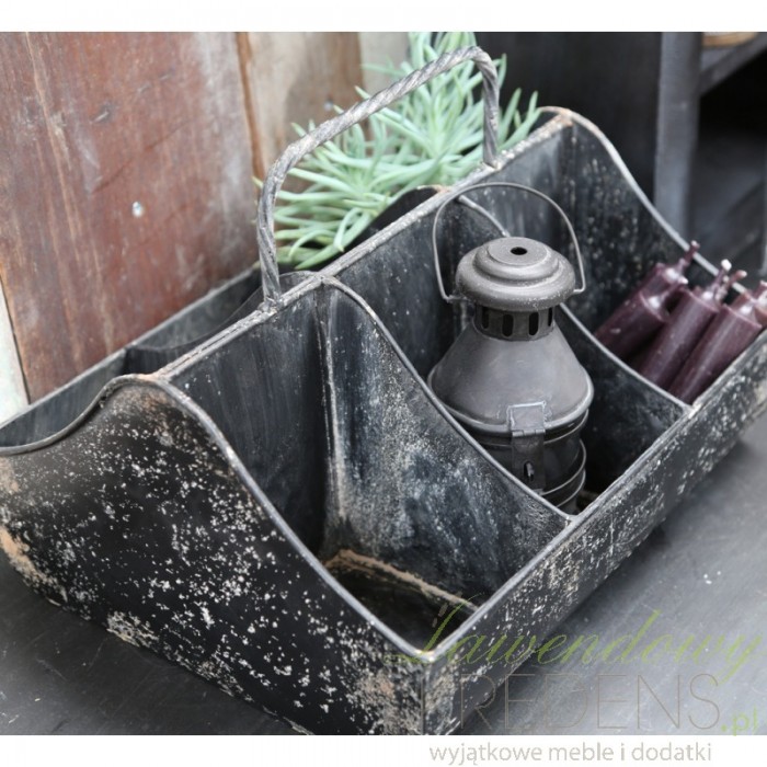 Mocno postarzony pojemnik metalowy z sześcioma przegródkami i uchwytem do przenoszenia. Pojemnik Chic Antique śmiało możesz wykorzystać wszędzie gdzie tylko zechcesz, czy to w kuchni na słoiczki z przyprawami czy też w łazience na kosmetyki. Pojemnik ma kształt prostokąta i szary kolor z odpryskami. Dodatki do domu wygladające na stare to prawdziwe cudeńka, których nie sposób znaleźć nigdzie indziej!