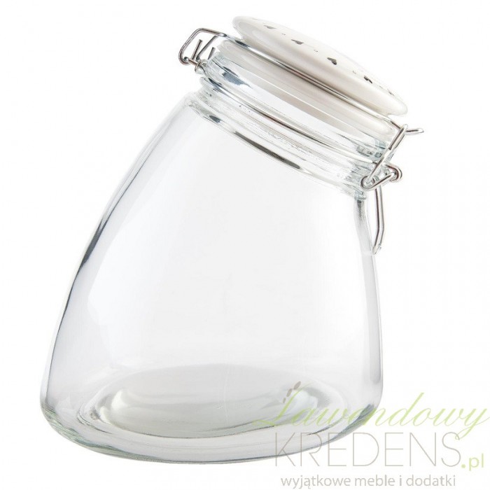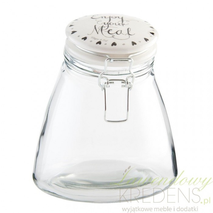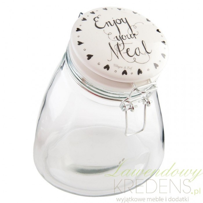 Szklany pojemnik z przykrywką znajdzie swoje miejsce na każdym kuchennym blacie. Na przykrywce przechylonego pojemnika znajdują się napisy i serduszka wokół. Pojemniki kuchenne o przecholonym kształcie wykorzystaj na kawę lub herbatę. Clayre&Eef to specjalista tworzący prowansalskie dodatki do kuchni.