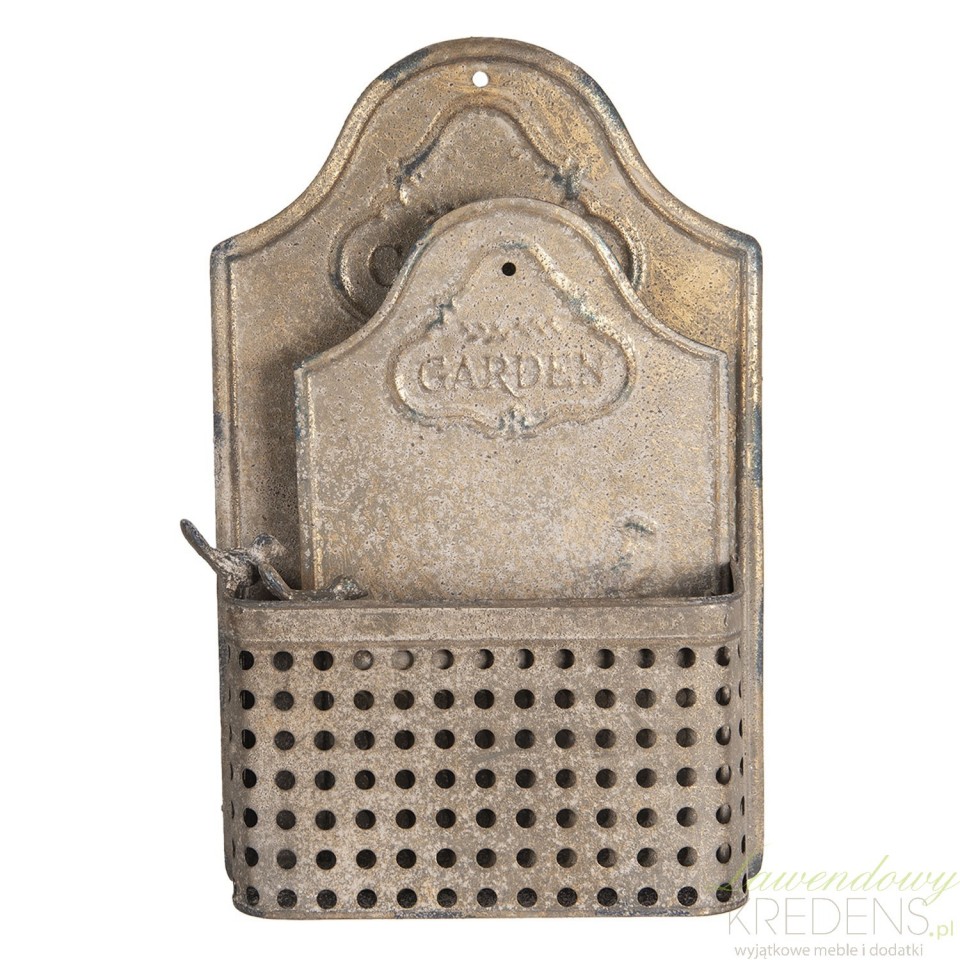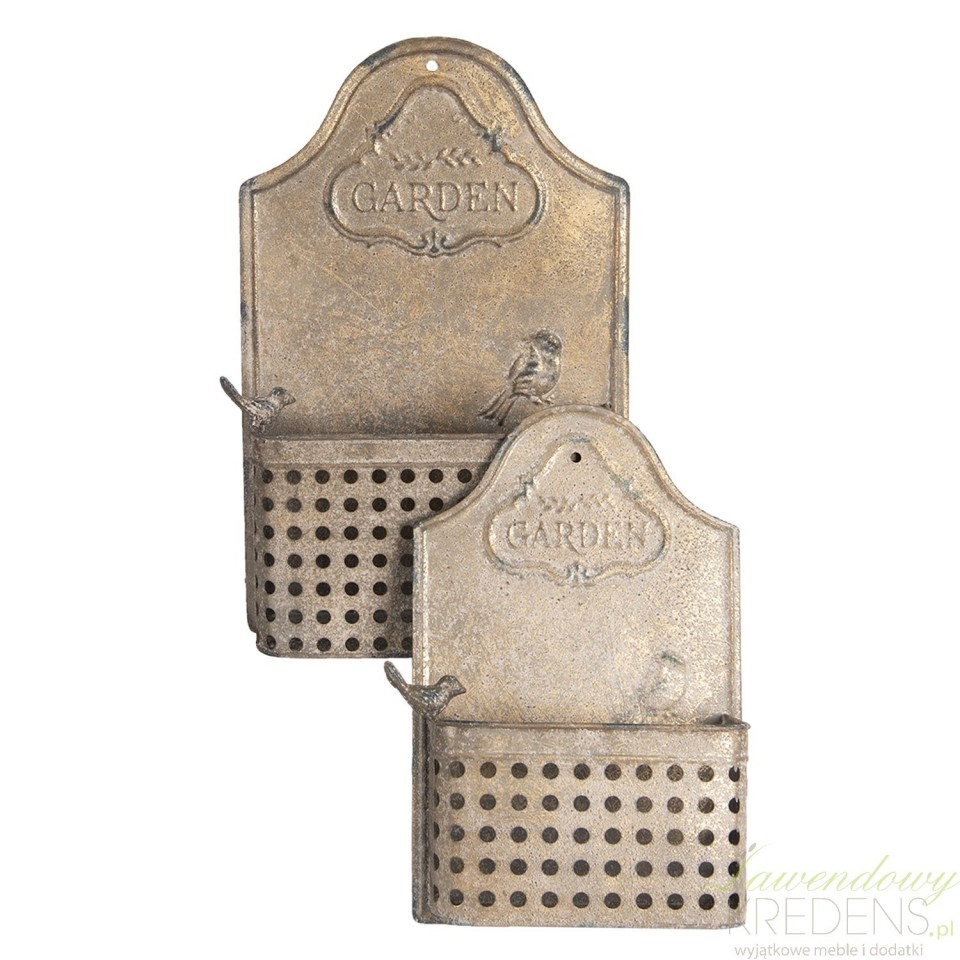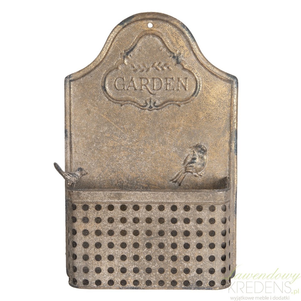 Oryginalne pojemniki ścienne wykonane z metalu w kolorze starego złota. Prosta konstrukcja oraz bogata charakteryzacja sprawiają, że pojemniki świetnie wkomponują się we wnętrza urządzone w prowansalskim i francuskim stylu. Pojemniki ścienne w stylu prowansalskim są funkcjonalną, a zarazem efektowną ozdobą ścienną. Zbudowane są z tabliczki z napisem GARDEN i ażurowej kieszonki udekorowanej małym ptaszkiem.