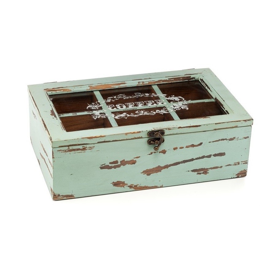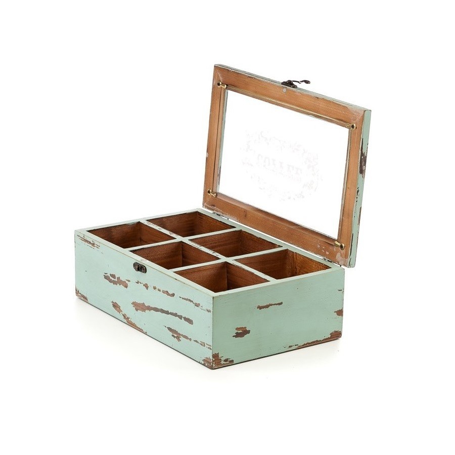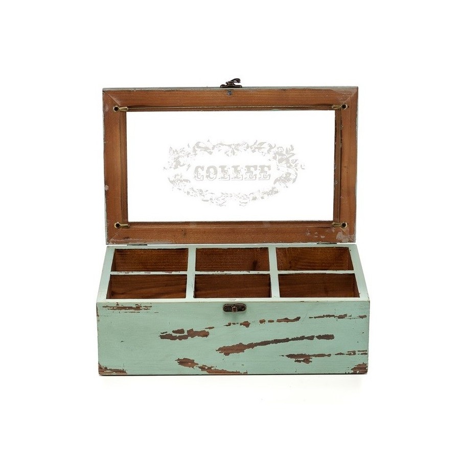 Dodatki w stylu prowansalskim to niecodzienne i niespotykane produkty, które uzupełniają stylistykę wnętrz. Pudełko Aluro wykonane jest z drewna z przecieraną farbą, a otwierane wieczko jest przeszklone. Drewniane pudełko z serii Mazine świetnie będzie wyglądać w kuchni. Posiada bowiem sześć przegródek na różne produkty.