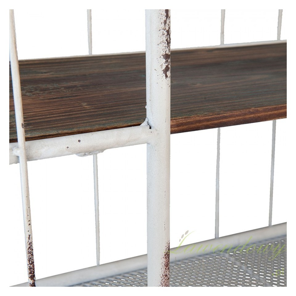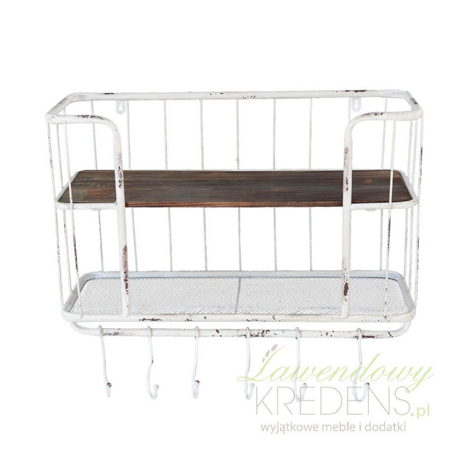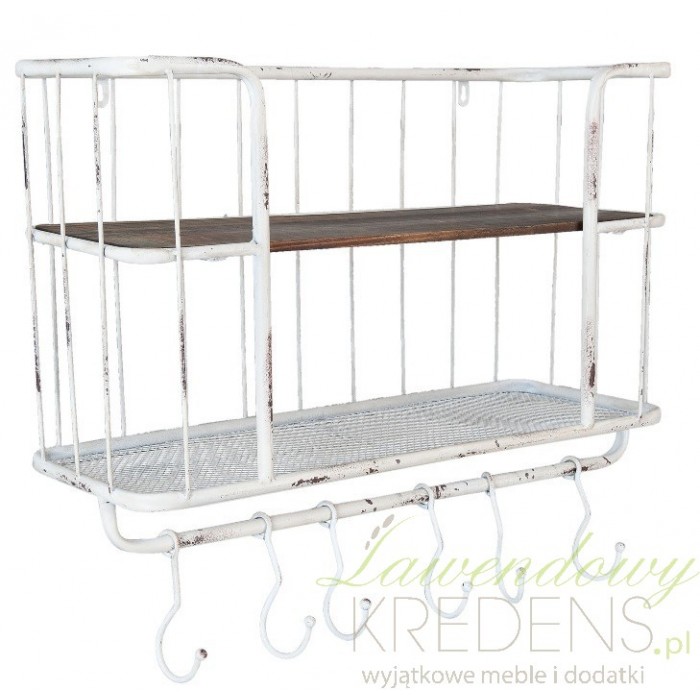 Meble Shabby Chic prezentują surowy, metaliczny styl, który jest idealny dla osób lubujących się w pięknie prostych form. Metalowa półka wyposażona została w ładne szczebelki oraz przydatne haczyki. Mebel został pokryty białą farbą a następnie poddany zabiegom odprysku, który stanowi jedną z cech stylu. Meble Shabby Chic - polecamy!