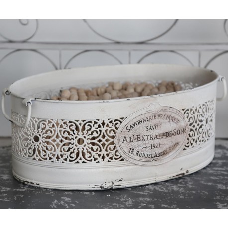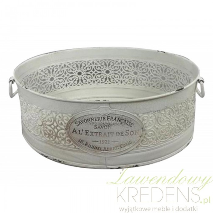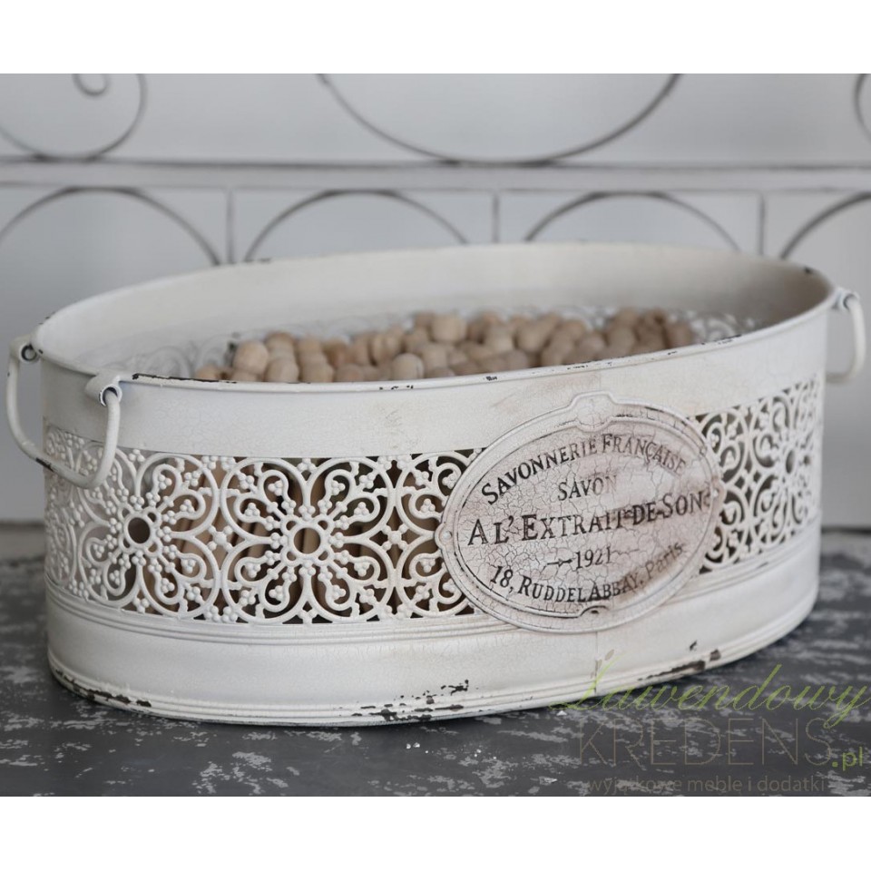 Dodatki do łazienki to nie tylko wieszaki czy kosze na ubrania, ale również różnego rodzaju pojemniki. Metalowy pojemnik firmy Chic Antique wykonany jest z metalu w kolorze białej, postarzanej farby. Posiada po środku finezyjną dekorację w formie kwiatka, sprawiającej wrażenie koronki. Z przodu zawieszona jest metalowa plakietka z francuskimi napisami.