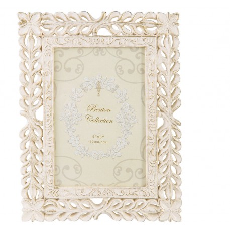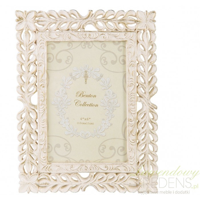 Kremowa ramka na zdjęcia jest wykonana z dekoracyjnie uformowanego tworzywa. Kwiatowe motywy i antyczne postarzenia tworzą razem spoistą całość. Prostokątna ramka z ażurowymi rzeźbieniami będzie godnie reprezentować rodzinne fotografie i portrety. Wybieraj dodatki prowansalskie Clayre&Eef i ciesz się oryginalnym i modnym wnętrzem już tego lata!