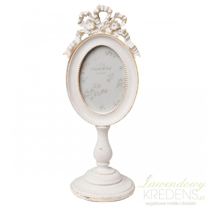 Stojąca ramka prowansalska na nóżce ma kremowy koloor i urocze zdobienie na samej górze.