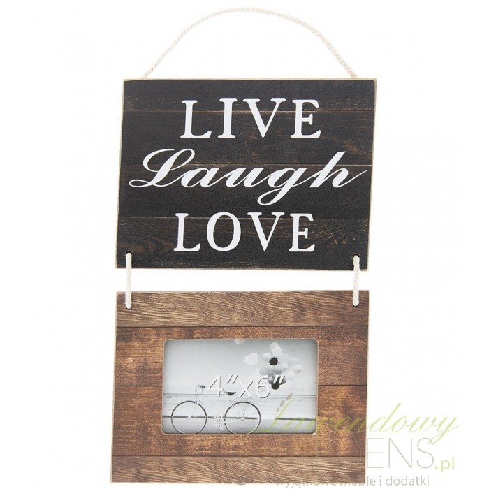 Ramki na zdjęcia od Clayre&Eef to oryginalne artykuły dekoracyjne. Każda z nich jest inna i wyróżnia się niepowatarzalnym designem. Ramka na zdjęcie wyglądająca jak drewniana ma kolor brązowy i połączona jest z czarną tabliczką z napisem "Live Laugh Love". Zawieszona na białym sznurku jest genialna do ozdoby ściany w salonie lub w pokoju nastolatka.