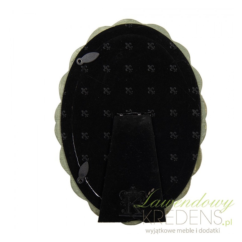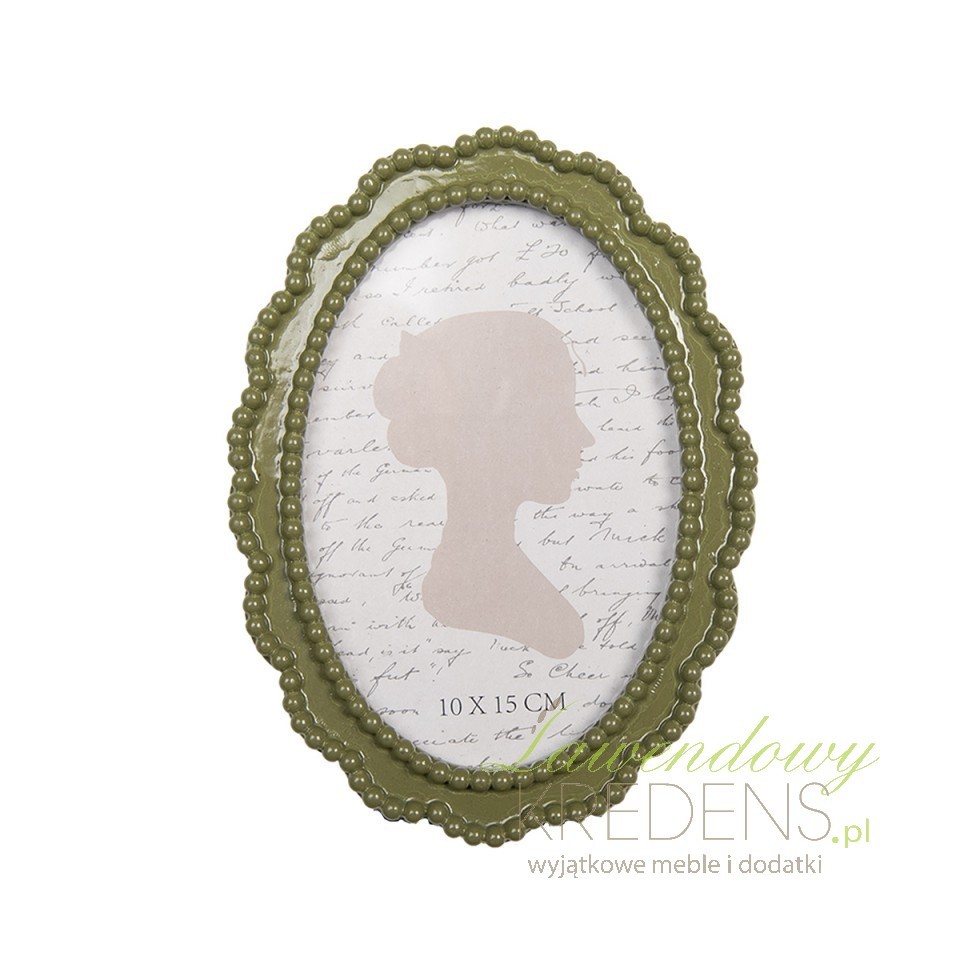 Stylowa ramka o owalnym kształcie w kolorze pięknej zieleni to idealna oprawa dla Twoich wspomnień. Wykończona dekoracyjną koralikową obwódką dodaje wnętrzu nuty retro elegancji.