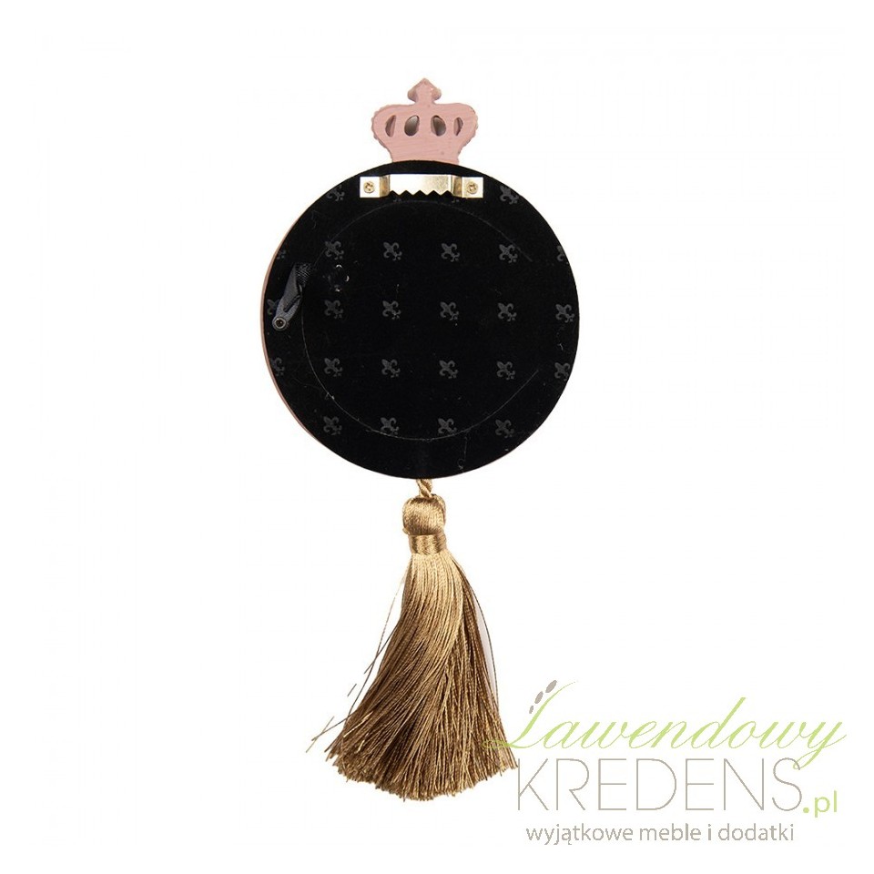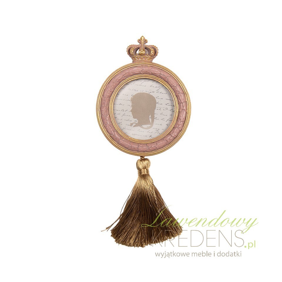 Ozdobna ramka ścienna w stylu pałacowym przyciąga wzrok królewską koroną i eleganckim chwostem. W złoto-różowej oprawie pomieści zdjęcie o średnicy 9 cm.