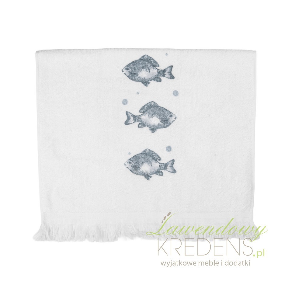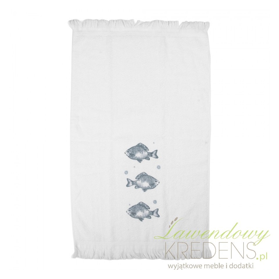 Uroczy ręcznik do rąk w stylu marynistycznym. Ozdobiony motywem trzech ryb i delikatnymi frędzlami. Idealny do łazienki nad morzem, domu w stylu coastal albo do kuchni w bieli. Wykonany z miękkiej bawełny. Praktyczny i dekoracyjny.
