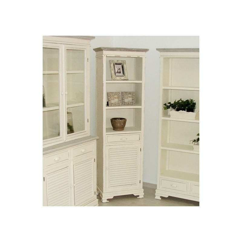 Celowo postarzany, wąski regał w stylu prowansalskim z licznymi półeczkami oraz szufladą.