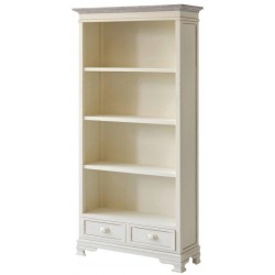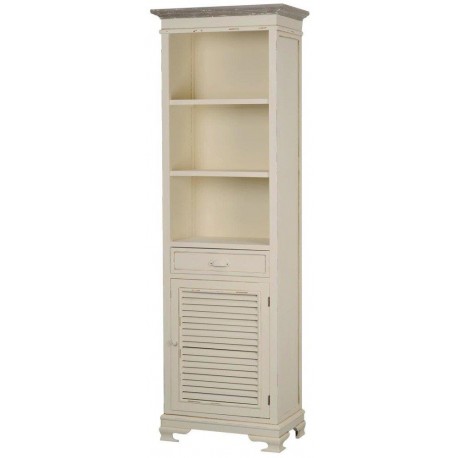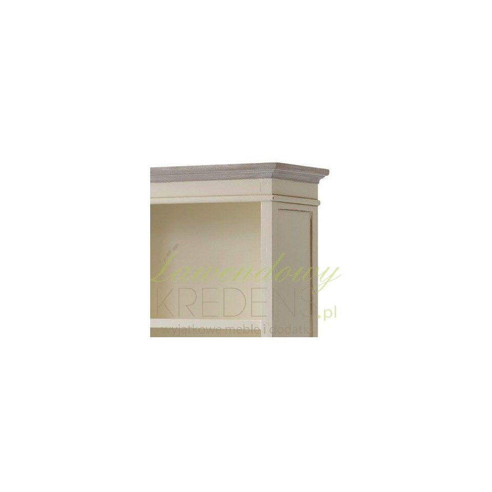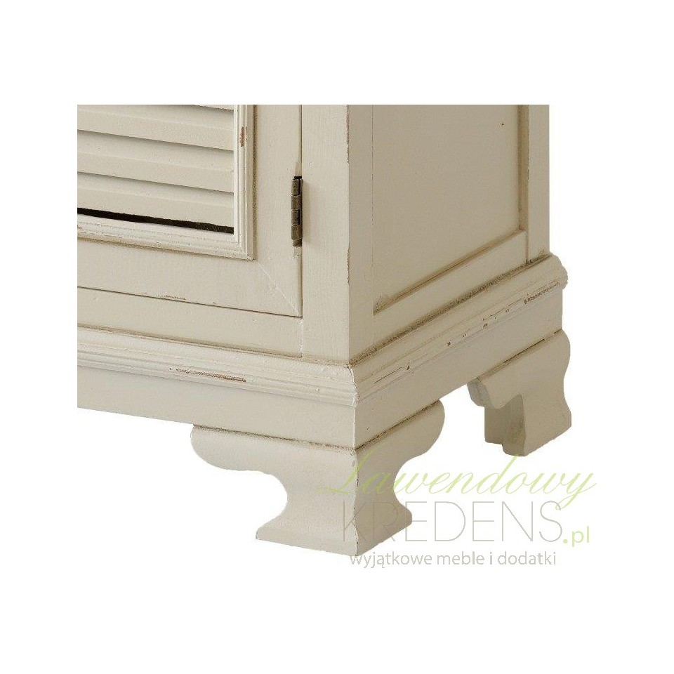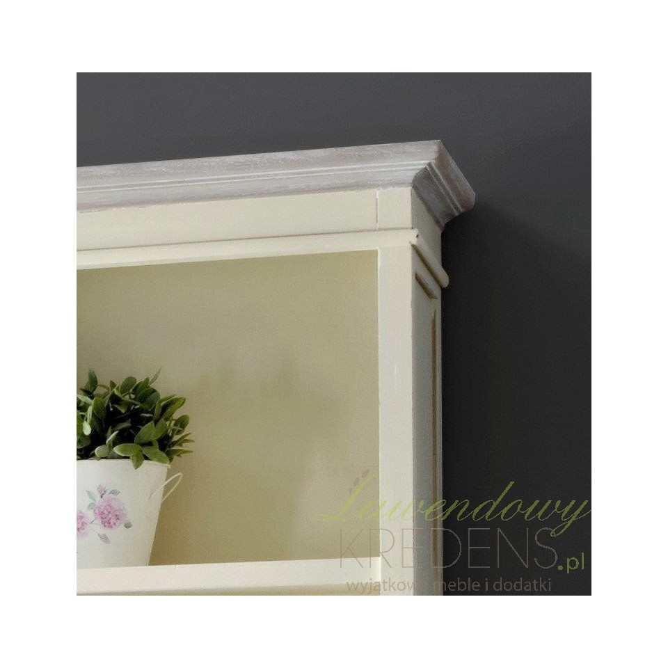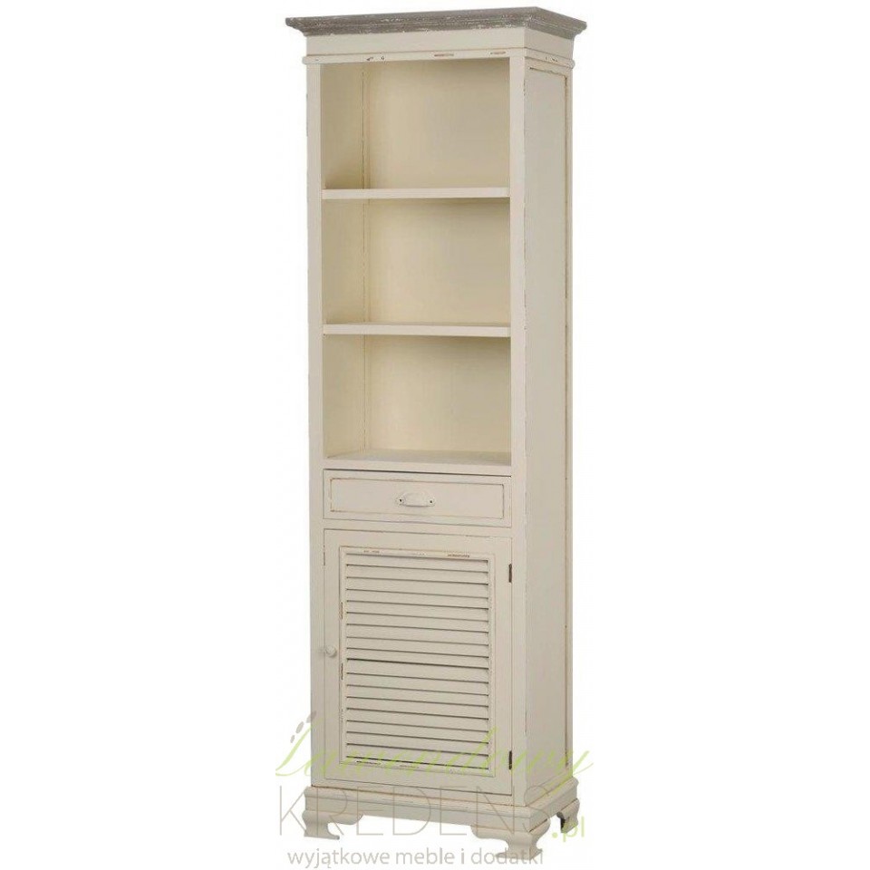 Wąski regał prowansalski idealny dla każdego miłośnika stylu prowansalskiego oraz shabby chic. Regał ma piękny, kremowy kolor jest celowo postarzany poprzez nieregularne przetacia farby znajdujące się przede wszystkim na krawędziach mebla oraz szuflady. Do regału mogą Państwo dobrać inne postarzane meble prowansalskie o tym samym kolorze.