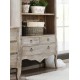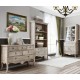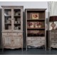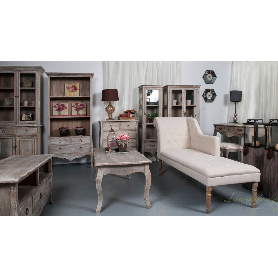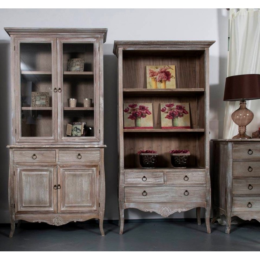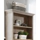 Piękny regał w stylu prowansalskim z półkami i szufladami wykonany z bielonego drewna.