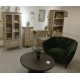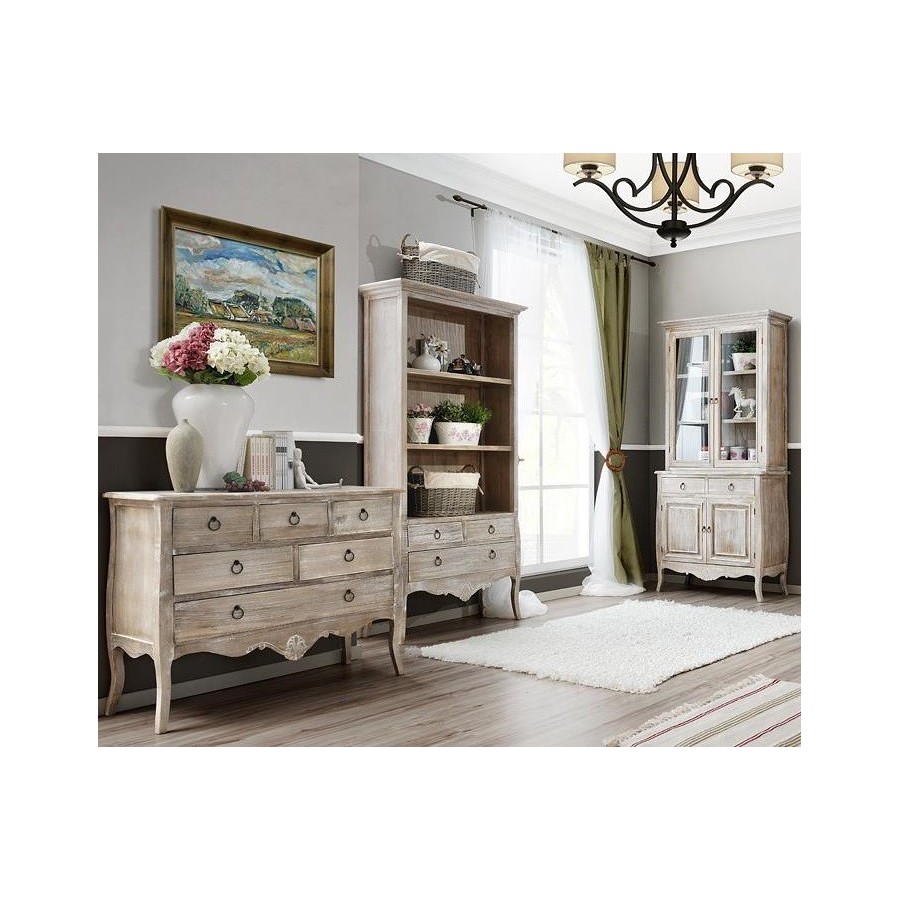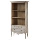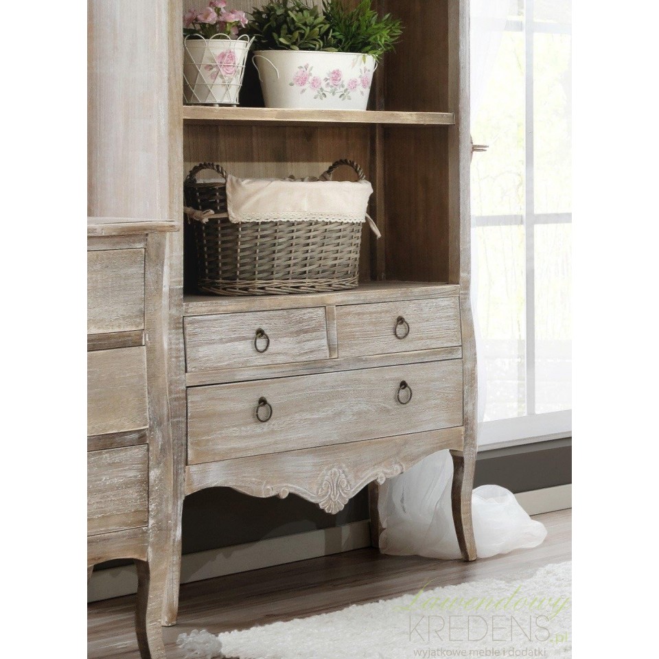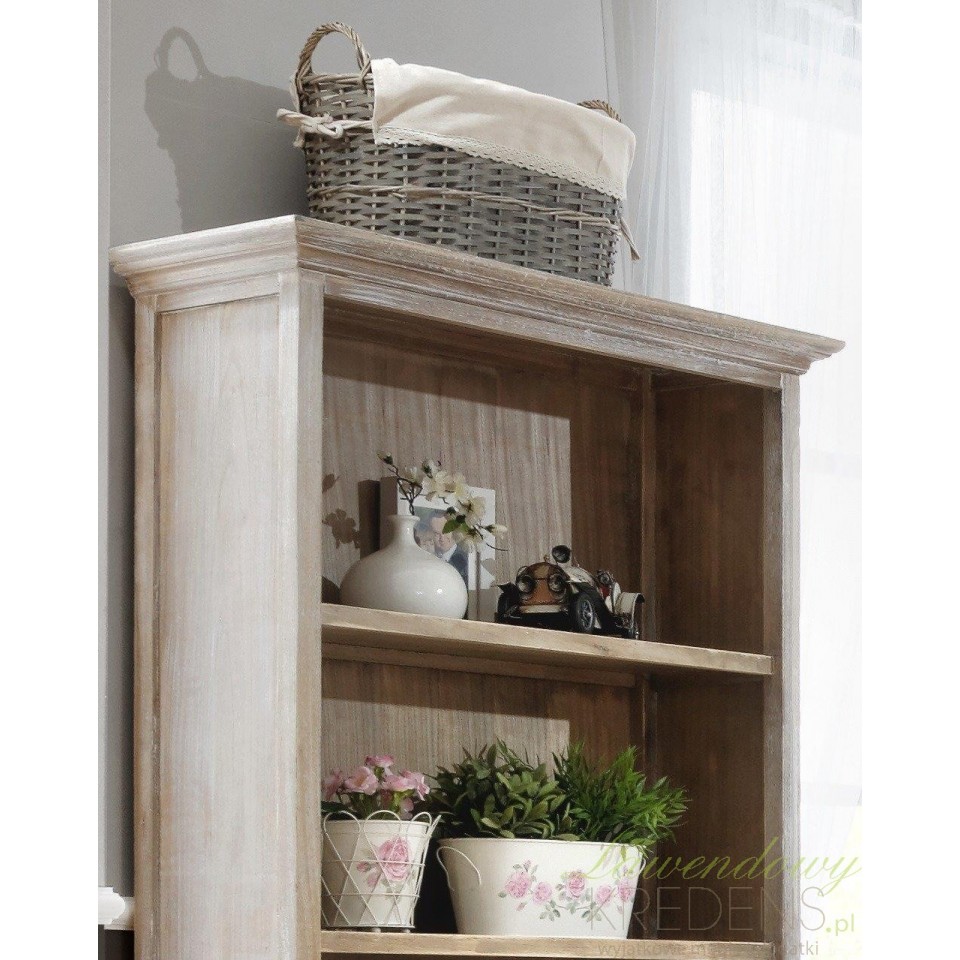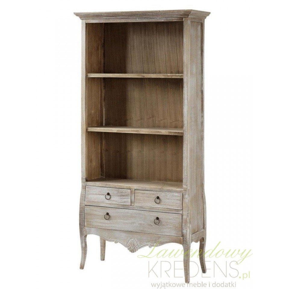 Regał prowansalski z bielonego drewna topoli idealny zarówno do kuchni jak i do salonu. Regał posiada trzy otwarte półki oraz trzy szuflady różnej wielkości z metalowymi uchwytami w kształcie kółek.