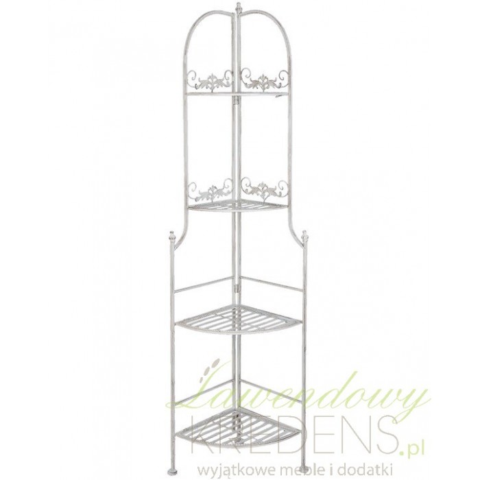 Meble metalowe to nowy trend w stylizacji wnętrz. Narożny regał metalowy świetnie będzie wyglądał w oranżerii czy salonie. Regał prowansalski ma biały kolor i liczne przetarcia farby. Ma cztery półki na kwiaty i zioła, a cały posiada przepiękne i urocze zdobienia.
