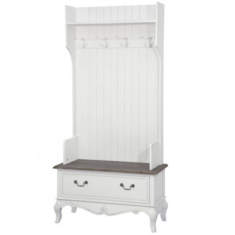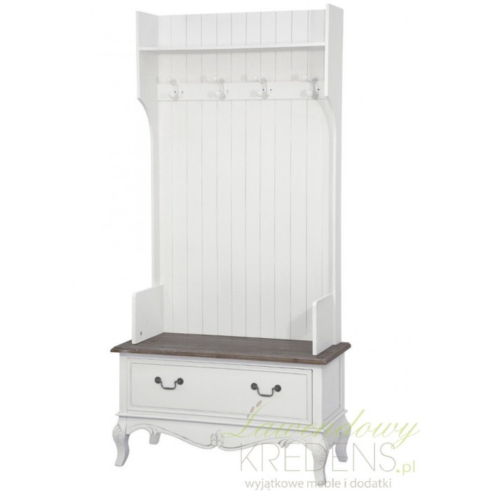 Meble w stylu prowansalskim to elegancja i klasa sama w sobie. Garderoba biała marki Livin Hill właśnie taka jest. Mebel wykonany jest z wysokiej jakości tworzyw, jest w kolorze białym i ma brązowe siedzisko. Garderoba posiada specjalne haczyki na których możesz powiesić odzież wierzchnią oraz szufladę w dolnej części w której możesz schować buty czy przedmioty, które najlepiej mieć pod ręką!