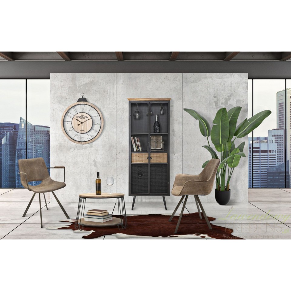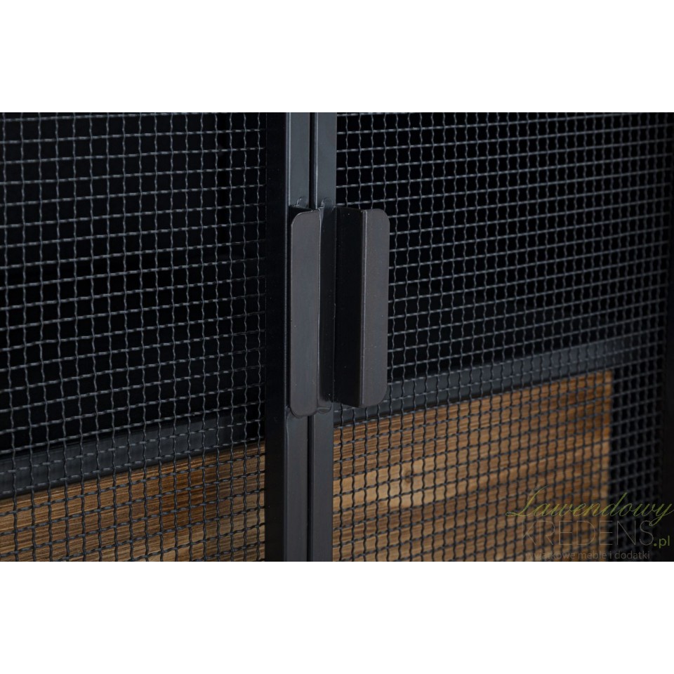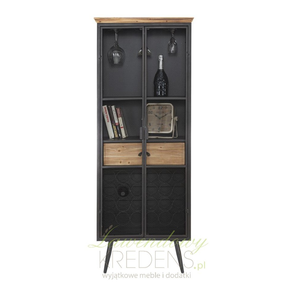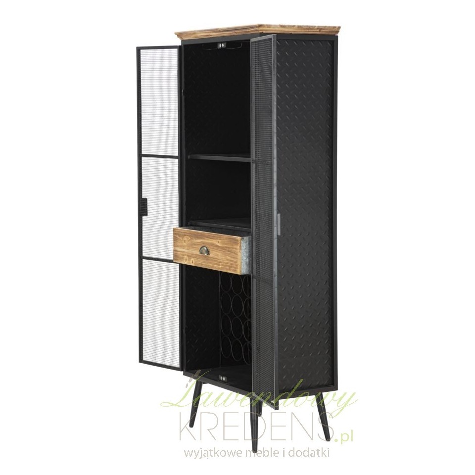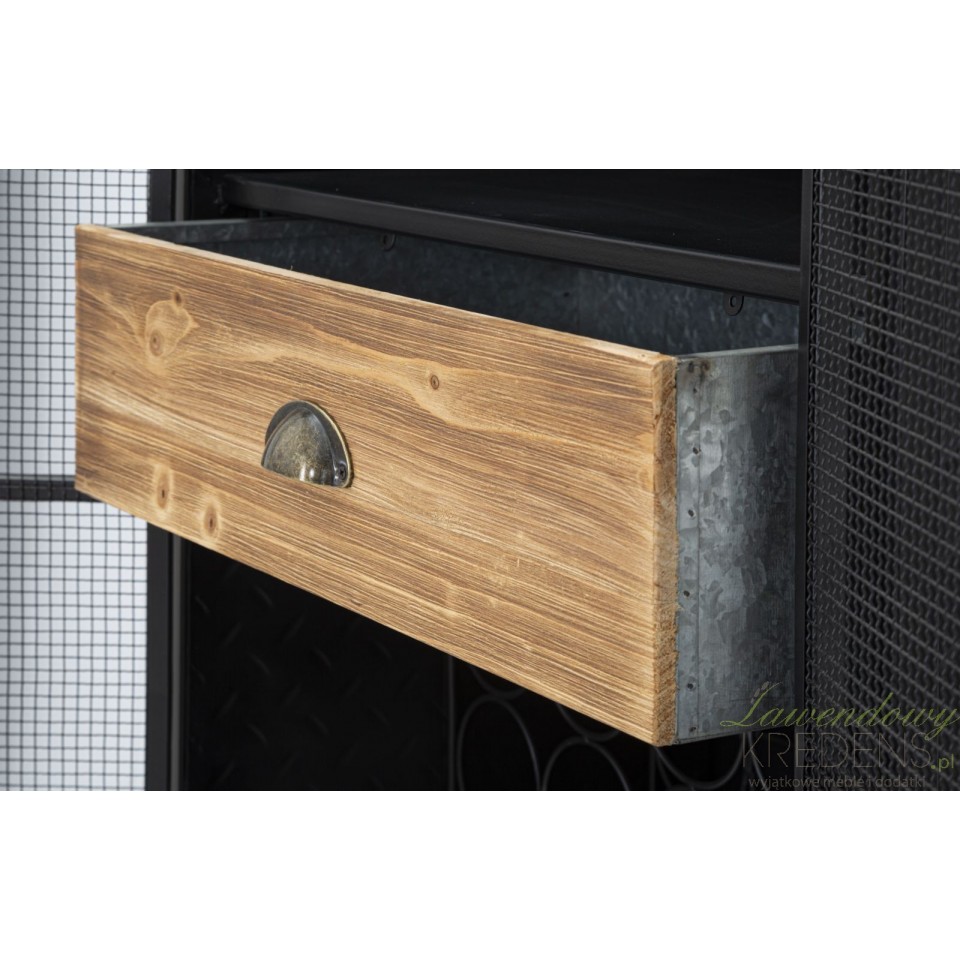 Regał na wino z kolekcji School przypomina elegancką witrynę, która posiada podwójne drzwi z metalowej siatki. We wnętrzu regału, w jego centralnej części znajduje się brązowa szufladka wykonana z drewna, wyposażona w uchwyt z metalu. Poza miejscem na wino, wewnątrz regału znajdują się również półki, na których możesz ustawić kieliszki i lampki do wina. Industrialne meble są wybitnym przykładem ponadczasowego wzornictwa.