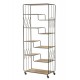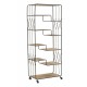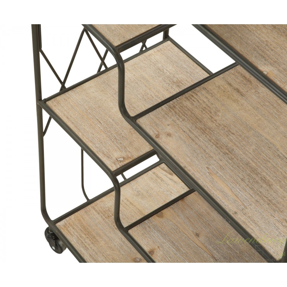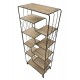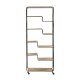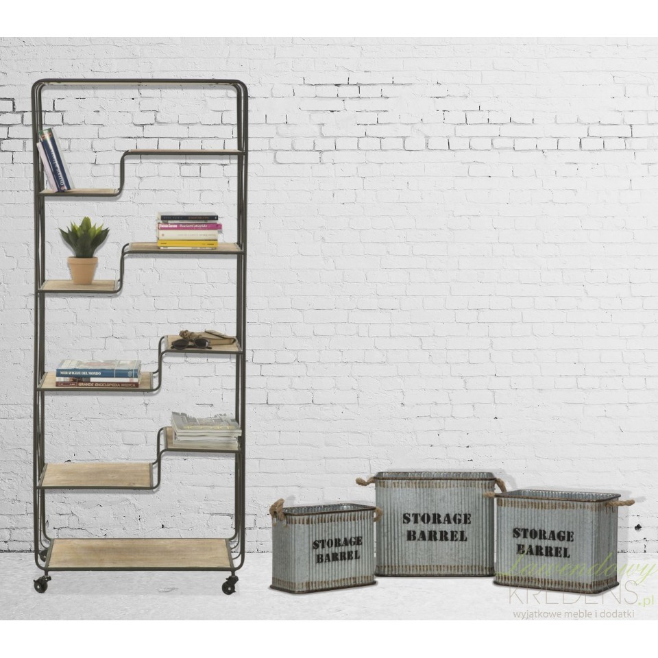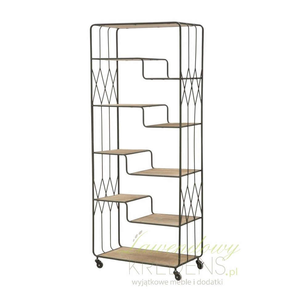 Wysoki regał loftowy z półkami wzorowanymi kształtem schodków w całości zrobiono z solidnych elementów metalowych.