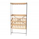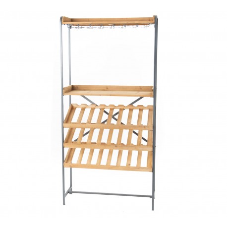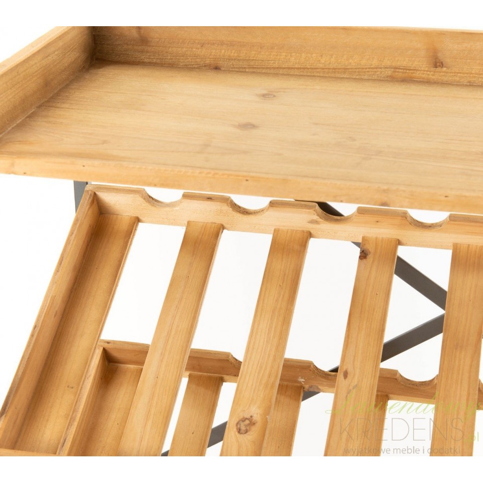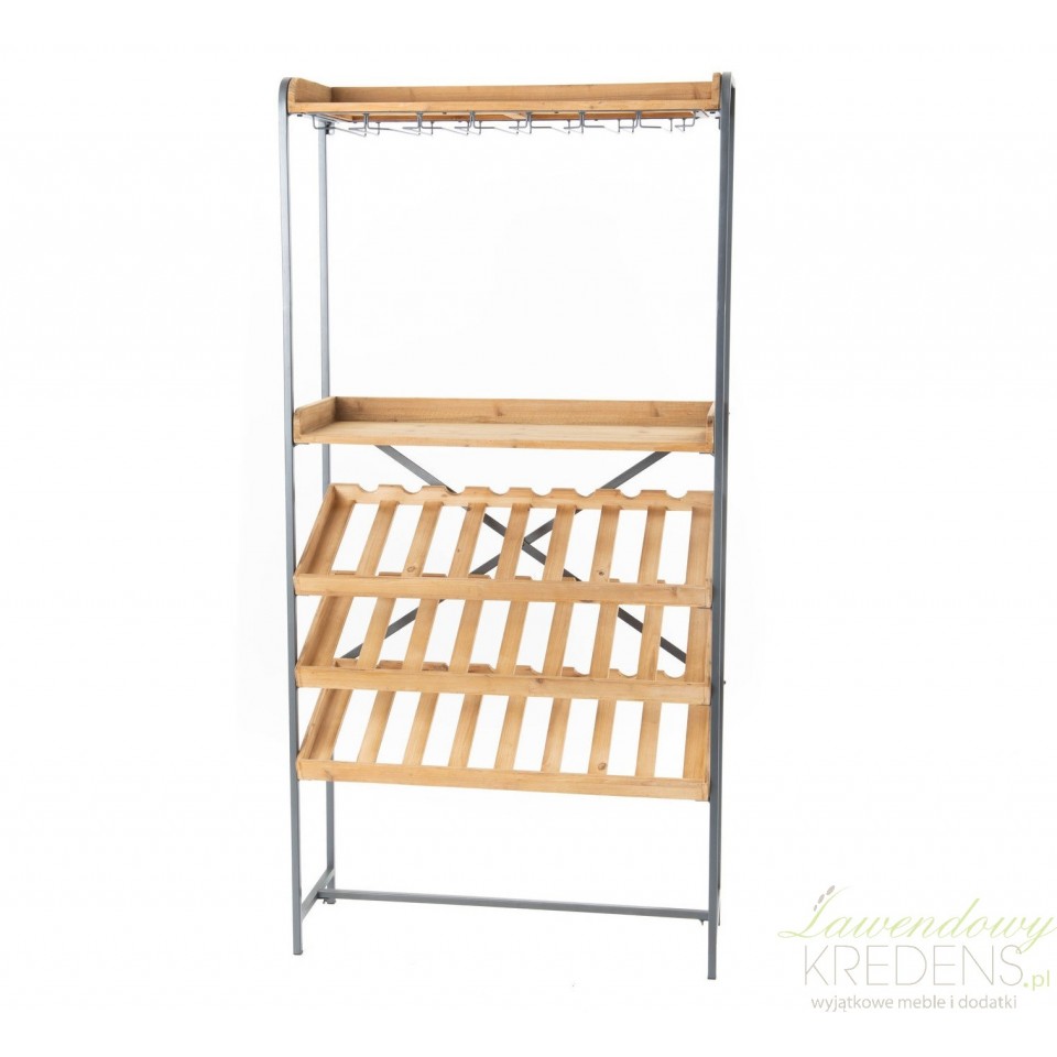Solidny regał na butelki z drewna i metalu wyposażony jest w trzy poziomy półek na wino. Eleganckie drewno w jasnym kolorze wzmocnione metalowym stelażem tworzy mebel odpowiedni do każdego wnętrza z uwagi na swoją uniwersalność. Zwróć uwagę na pozostałe atuty, które posiada regał w stylu industrialnym - to miedzy innymi uchwyty na kieliszki i obszerny blat. Takie meble w stylu industrialnym dodadzą pomieszczeniom świeżego designu.