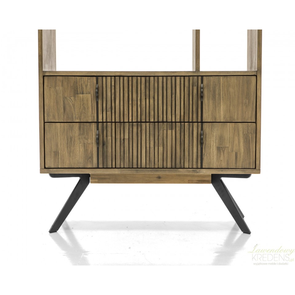 Wyżej, na dwóch poziomach, rozciągają się dwie półki, podzielone na dwie części. To idealne miejsce do eksponowania książek, dekoracji czy innych przedmiotów, które chcesz mieć zawsze pod ręką. Półki te nie tylko dodają funkcjonalności regałowi, ale również nadają mu lekkości.