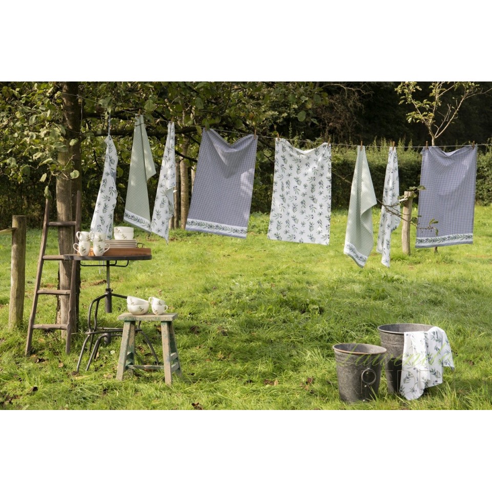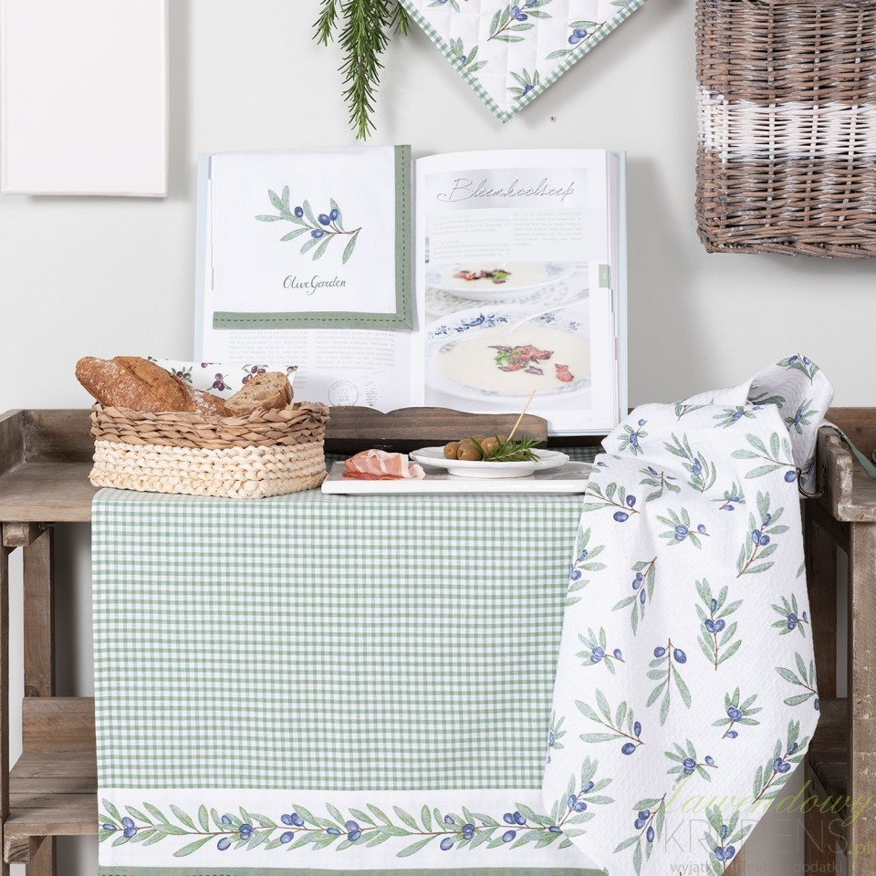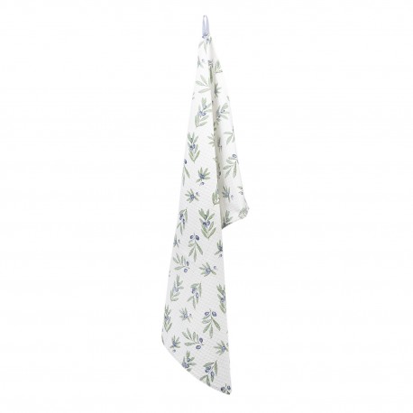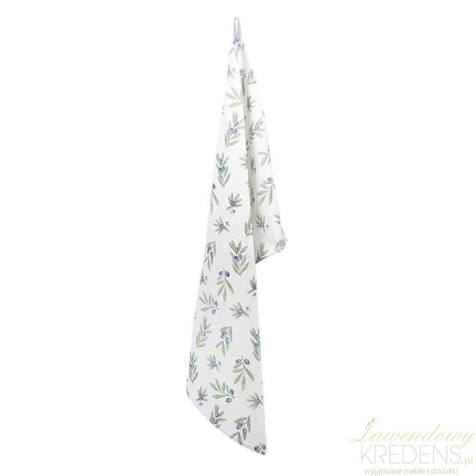 Funkcjonalna i schludna ściereczka kuchenna w kolorze białym z oliwkowymi listkami, oferowana przez holenderskiego producenta Clayre&Eef.