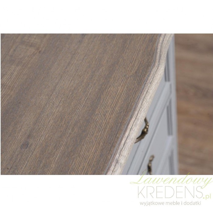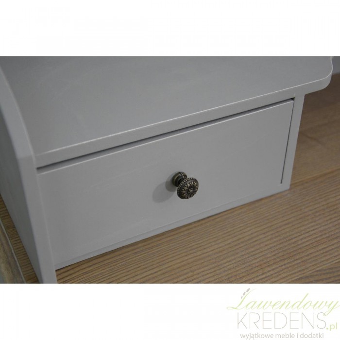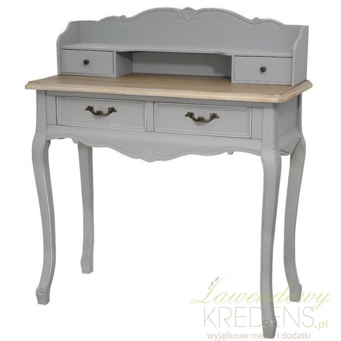 Meble prowansalskie słyną nie tylko z niebanalnego wyglądu ale również z praktycznych możliwości wykorzystania. Ten seketarzyk prowansalski to miejsce, które może Ci posłużyć jako toaletka lub biurko. Sekretarzyk w stylu prowansalskim wykonano z drewna, cudnie wyrzeźbiono i pomalowano na szaro. Szary korpus zestawiono kolejno z brązowym blatem i praktyczną nadstawką z szufladkami.