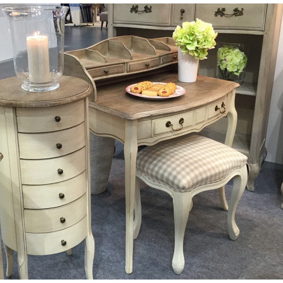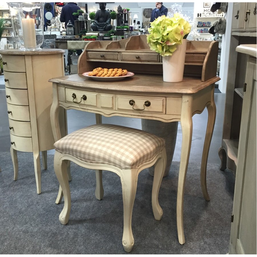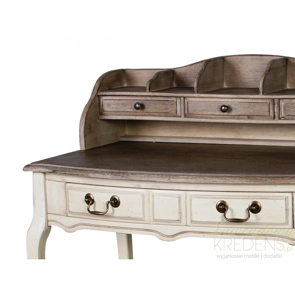 Sekretarzyk w stylu prowansalskim, tak jak pozostałe meble prowansalskie, sprawia wrażenie lekkości i nada wnętrzu oryginalny charakter. Wsparty na czterech zgrabnych nogach, posiada dwie szuflady pod blatem, oraz półkę z trzema szufladkami nad blatem. Nadbudowa została specjalnie szczotkowana, aby nadać sekretarzykowi niepowtarzalnego wyglądu.