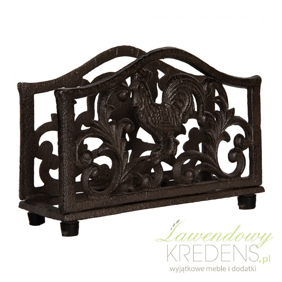 Żeliwny serwetnik Clayre & Eef z motywem koguta to urokliwy dodatek w stylu farmhouse i prowansalskim. Ozdobny wzór liści i klasyczna forma wprowadzają do wnętrza klimat wiejskiej kuchni pełnej ciepła i rodzinnej atmosfery.