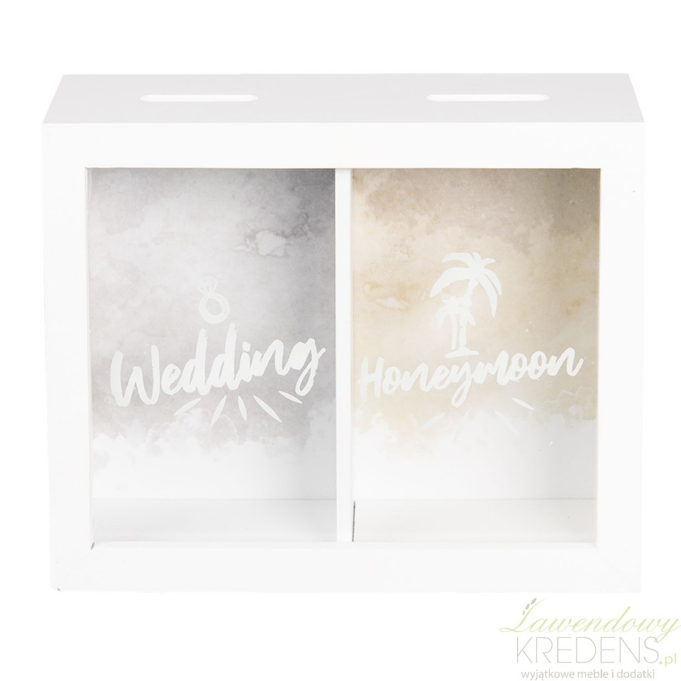 Oryginalna, pomysłowa skarbonka na wesele i na podróż poślubną w kolorze białym z szklanym frontem, dzięki czemu możesz łatwo podejrzeć zawartość skarbonki. U góry znajdują się dwa otwory, przez które można wrzucać banknoty i monety. Spełnij swoje marzenia, ale najpierw odłóż na nie pieniądze wrzucając je do skarbonki od marki Clayre&Eef. Biała skarbonka z napisami to świetny pomysł na prezent z okazji wieczoru panieńskiego lub kawalerskiego.