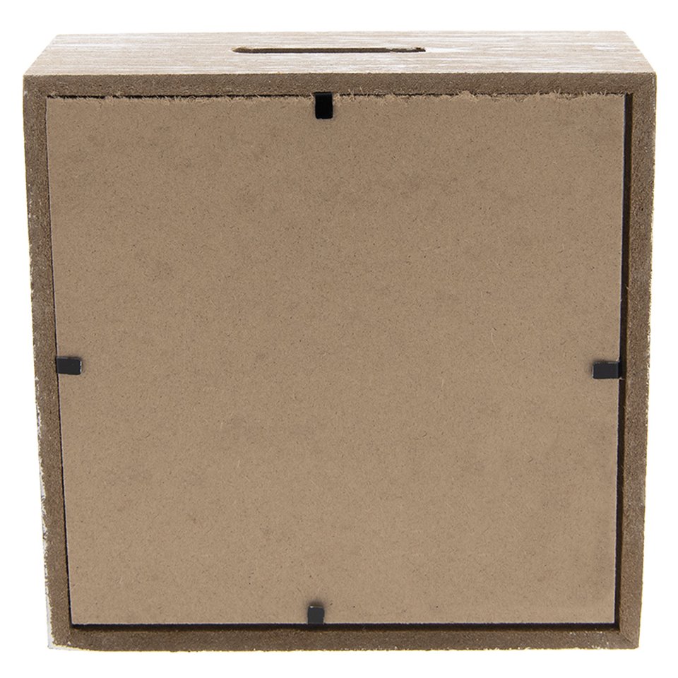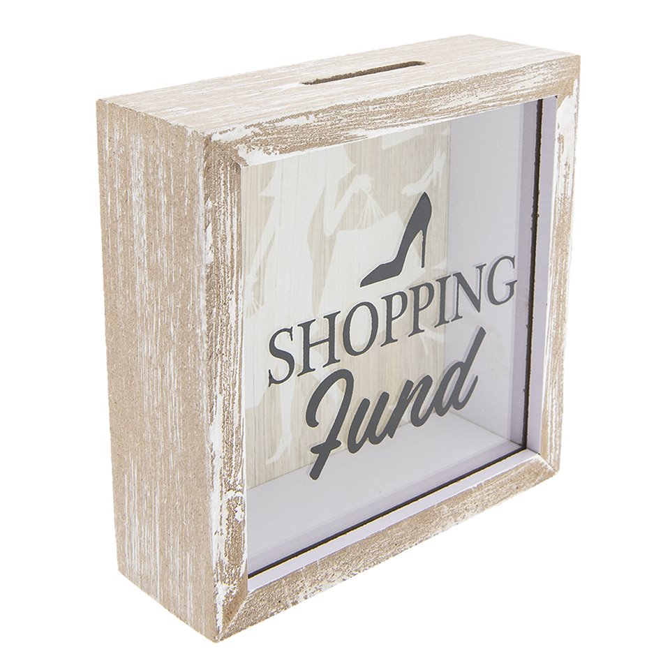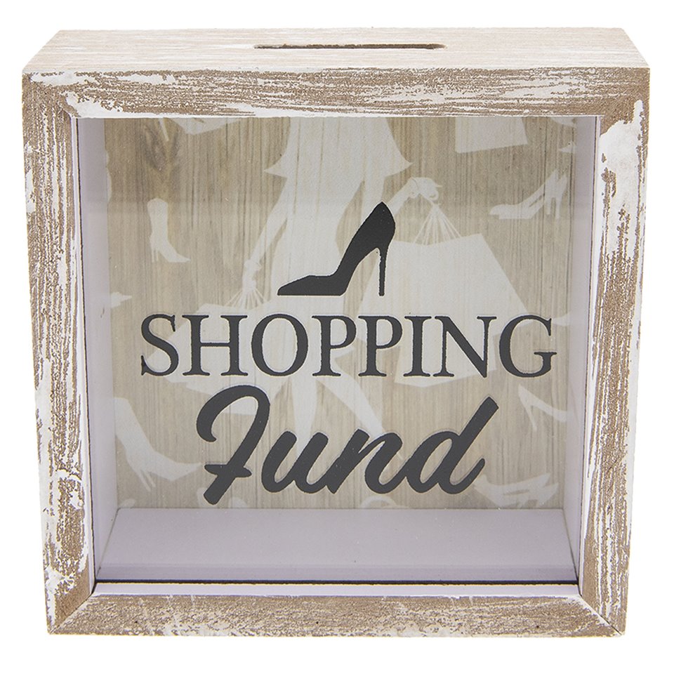 Postarzana skarbonka na zakupy wykonana w stylu retro, to ciekawy element wystroju wnętrza na półkę w pokoju każdej kobiety. Brązowa skarbonka wyposażona jest w przeźroczystą szybkę z napisami i czarnym pantofelkiem. Skarbonka w kształcie prostokątnej bryły może stać się ozdobą do wyeksponowania na półce w salonie lub na biurku. Kobiece dekoracje od Clayre&Eef skradną serce każdej damy.